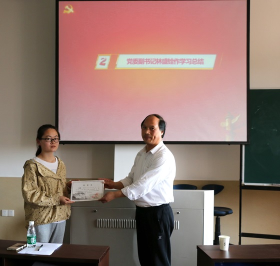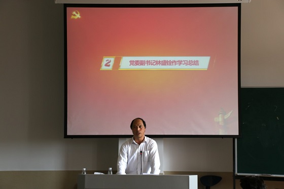 第二项议程为公共事务学院党委副书记林盛铨对本期党校进行回顾总结。本期党校在校党委和院党委的精心组织下,以党史党情教育为主线,以党章和党的基本知识为主要内容,通过各种丰富的学习形式使同学们联系理论与实践,掌握了党的基本知识、基本路线和基本纲领等重要的内容,增强了认同感。林老师在对学习情况、同学们学习收获与效果进行了点评与总结之后,更是对同学们提出了殷切的期望与要求,鼓励同学们将个人理想同实现中华民族伟大复兴、与伟大中国梦的奋斗目标紧密联系起来,努力成为中国特色社会主义事业合格的建设者与可靠的接班人。林老师强调,同学们应练就过硬本领,发挥先锋模范作用;也应不断学习新知识,将勤奋学习的成果奉献、服务于社会,时刻以党员的高标准要求自己,以实际行动争取向党组织靠拢。