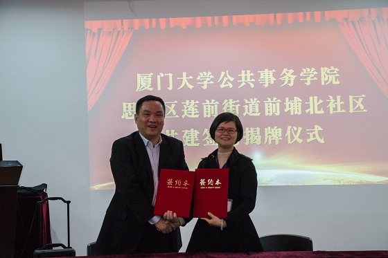 随后,刘弢书记和陈建萍签订共建协议。双方领导共同为“厦门大学公共事务学院实习实践教育基地”揭牌,学院与前埔北社区合作共建正式启动。接下来,双方将从社区治理和学生培养的实际出发,多方位、多层次开展合作共建,把十九大精神的宣传学习、贯彻落实工作引向深入。