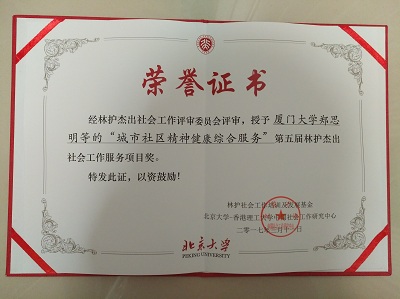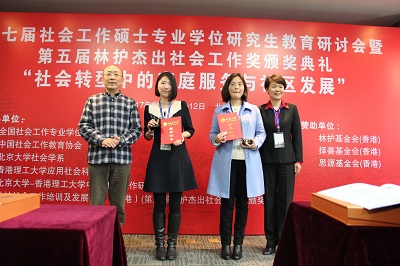 2017年3月11日,社会工作学界最高的奖项——第五届林护杰出社会工作奖颁奖典礼在北京大学举行,我院郑思明老师负责的《城市社区精神健康综合服务》项目荣获该奖项。民政部社会工作司司长吕晓莉等领导嘉宾出席致辞并为获奖代表颁奖。“林护杰出社会工作奖”是由香港林护基金会设立,香港理工大学应用社会科学系和北京大学社会学系联合举办,这是一个专门针对社会工作专业人员和项目的奖项,已连续进行五届,对激励社会工作学生坚守专业价值观、成长为优秀的社会工作者,为做好社会工作示范项目,产生了重要影响。本届设学人奖1名,社会工作服务项目奖2名,实习项目奖4名,学生奖4名,其中社会工作服务项目以机构/单位/部门为单位,项目的工作目标是为了争取社会群众或社会中某些特殊及弱势群体的利益,利用民间资源而开展的一系列公益项目。本届林护杰出社会工作奖的评审委员会评委分别是民政部社会工作司吕晓莉司长、北京大学社会学系刘能教授、北京大学-香港理工大学中国社会工作研究中心王思斌教授、中国社会工作学会史柏年教授、香港理工大学副校长阮曾媛琪、香港理工大学应用社会科学学系黎永亮教授、香港社会工作人员协会梁佩瑶会长。