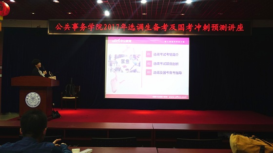 为了让我院学生充分备考选调生、公务员考试,短期内有效提高成绩,2016年11月21日晚7点,由公共事务学院团总支实践部主办的2017年选调生备考及国考冲刺讲座在自钦楼2楼多功能厅举办。本次讲座特邀中公教育柳晓丽老师为同学们面对面答疑解惑。