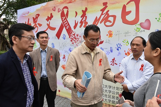 12月1日是世界艾滋病日,今年的宣传主题为:行动起来,向“零”艾滋迈进。为表达对青春对生活对生命的热爱,厦门大学计划生育领导小组联合校团委、公共卫生学院、公共事务学院、 演武社区居委会、白城社区居委会开展预防艾滋病宣传活动。公共事务学院承办思明校区预防艾滋病宣传活动,校党委副书记、厦门大学计划生育领导小组组长赖虹凯,校工会常务副主席宋毅,校工会副主席秦红梅、李招淡,校团委副书记廖晓波,公共事务学院党委副书记林盛铨,公共事务学院团委副书记蒋慧琼,辅导员李思颖、苏毅辉到场参加宣传活动。