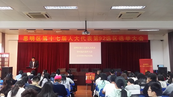 公共事务学院党委书记刘弢受思明区人大选举厦门大学办事处的委托,主持本会场的选举大会。在各单位工作人员清点选民人数后,刘弢宣布思明区第92选区公共事务学院分会场选举大会正式开始。大会通过代表选举办法,以及选举总监票人、总计票人、监票人、计票人名单。