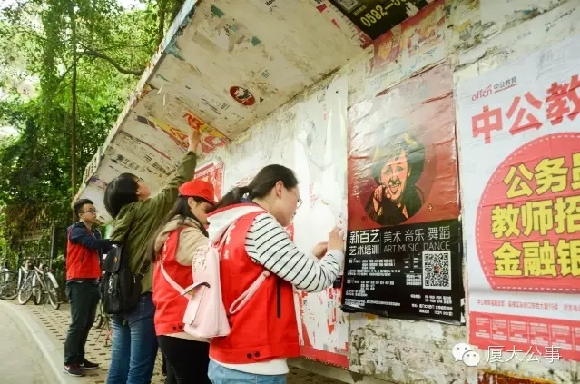 公共事务学院,就像这个名字一样,这里的学子都是怀一颗公心,去做服务人民的事,去真正关怀社风民情。清理广告栏这项志愿活动,寄托了大家对公共领域的观察与情感的寄寓。清理小小的广告栏,只是公事学子对“兼济天下”的小小表达。在实现理想的道路上,公事人还在前行,也未曾止步,就让“志愿”成为我们的习惯!
