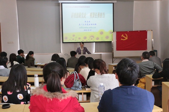2015年12月31日辞旧迎新之际,公共事务学院党委于成智楼108隆重举办新党员入党宣誓仪式暨新党员培训会,这是院党委首次开展的以新发展的党员为对象的教育培训活动,院党委希望通过一系列活动,增强新党员的党员身份意识,能够切实在今后学习生活中起到模范带头作用。校党委组织部副部长廖志丹、学院党委副书记赵晓慧,辅导员谭超、李思颖、苏毅辉出席了活动,会议由院团委书记徐莹主持。