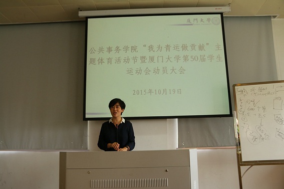 10月19日,公共事务学院“我为青运做贡献”主题体育活动节暨厦门大学第50届学生运动会动员大会在成智楼108举行,学院党委副书记赵晓慧做动员讲话。