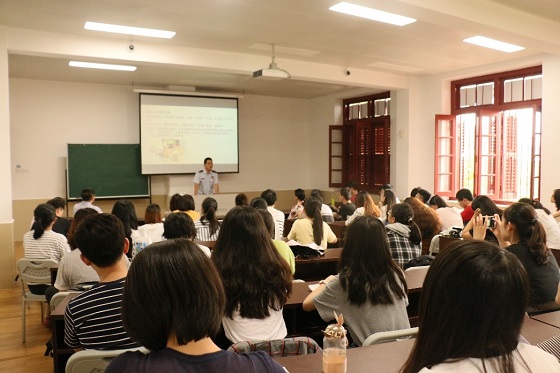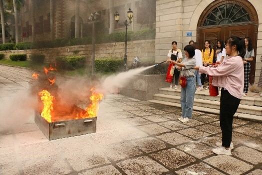 周强科长首先对在场师生进行了消防相关的理论培训。他分别从火灾危害影响、火灾消防相关负责人制度、切实排查生活中的火灾隐患等角度,结合现实案例辅以相关信息的阐述,讲解消防相关知识,包括在日常生活中对火灾的预防、火灾来临时的应急措施、如何进行正确的火情报警、生活中常见的消防设施等。同时,周科长还讲解了灭火器的使用步骤,以及如何用灭火器进行初起火情的灭火,并邀请同学上台现学现用,亲自示范指导灭火器的使用步骤。此外,周科长还给参加培训的师生带来了“小礼物”——印有“厦门消防”的口哨和手电筒,可于危急时刻派上大用场。