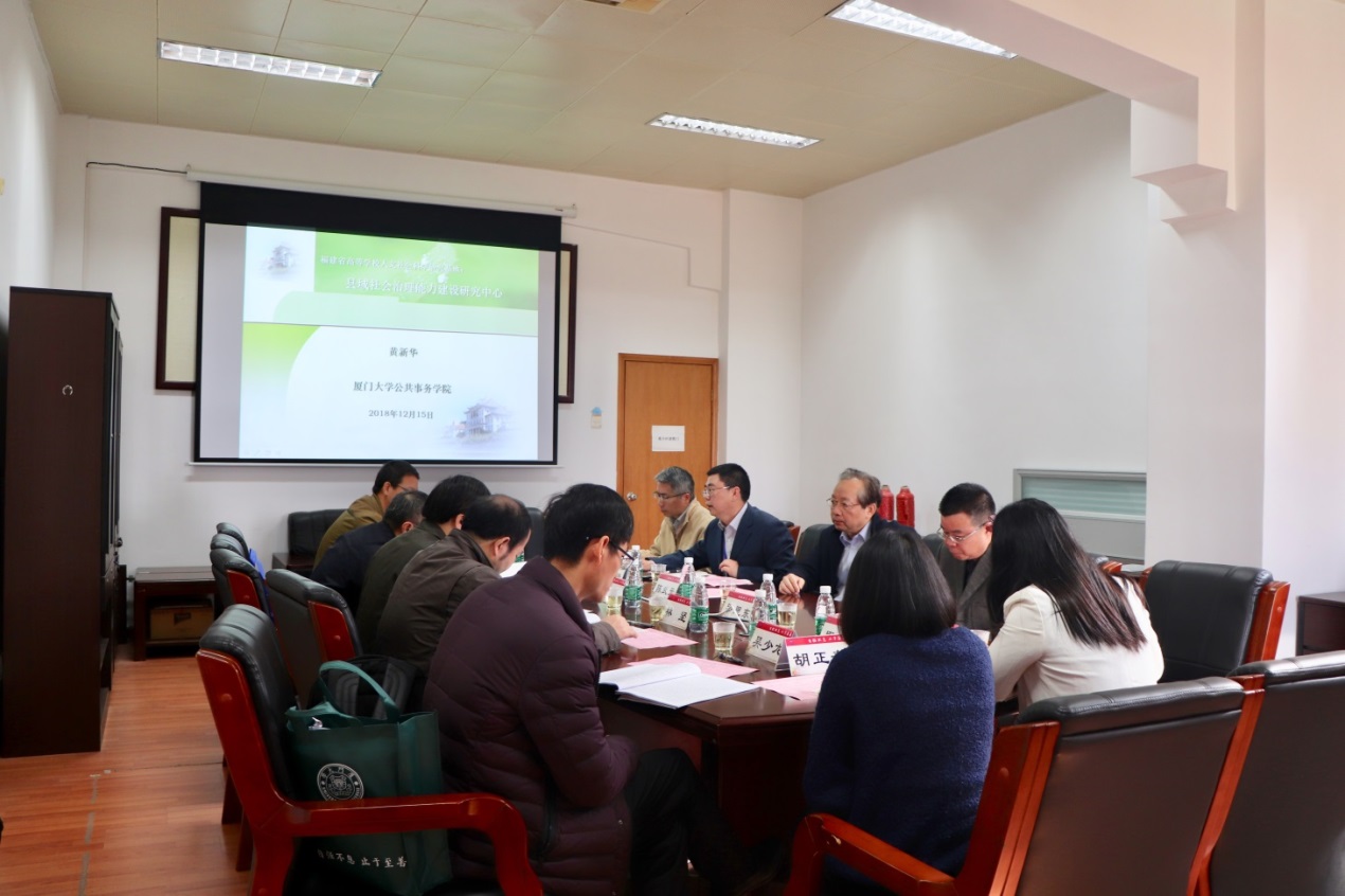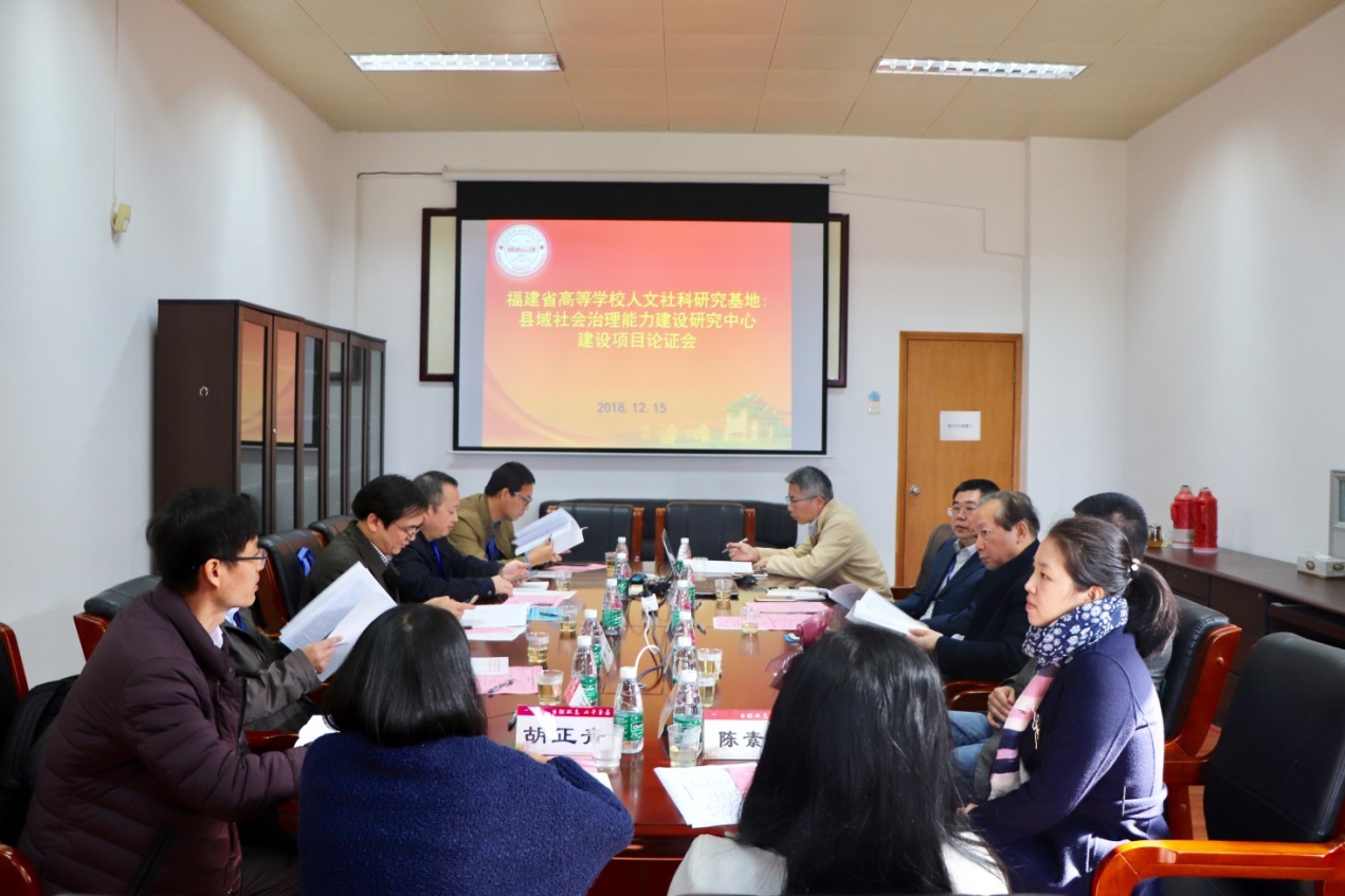 校社科处处长陈武元教授主持了会议并讲话,研究基地主任黄新华教授汇报了中心工作情况,专家组认真审阅了有关材料、听取了建设项目的汇报,并形成专家组论证意见:认为该中心研究内容充实、特色鲜明、目标明确,研究规划科学可行,研究思路设计层次分明、逻辑性强,具有重要的理论意义和价值。专家组一致通过“福建省高校人文社会科学研究基地——县域社会治理能力建设研究中心”建设项目的论证,建议省教育厅予以立项。