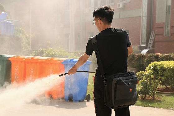接着他告诉同学们如何扑灭初级火灾。他首先指出发现火灾后每个人都有义务报火警,但是应对初级火灾时,我们自己利用身边的消防器材也能及时灭火。然后他讲解并演示了常见的手提式灭火器的正确使用方法:第一步要起灭火器,然后拔掉保险销,接着压下压把,最后把软管对准火喷射确保火势完全扑灭才算结束。并指出扑灭火灾时首先要注意看是否带电,如果带电需先断电再使用灭火器灭火。参加此次培训的同学们在老师的邀请下积极学习使用灭火器,同时孙老师在旁边进行指导。