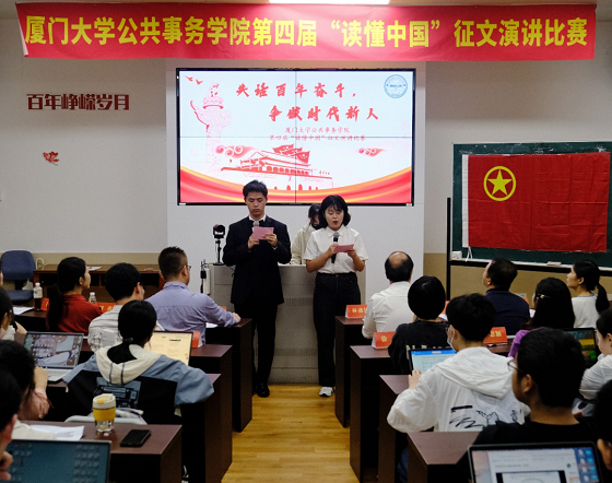 为促进青年学生深入学习十九届六中全会精神和习近平总书记在庆祝中国共青团成立100周年大会上的重要讲话精神,迎接党的二十大胜利召开,使更多大学生深切感悟中国共产党的历史担当,坚定听党话、跟党走的信念与决心,按照学校开展“四史”教育活动的工作要求,厦门大学公共事务学院5月27日晚在成智楼108成功举办第四届“读懂中国”征文演讲比赛。校团委副书记梁振伟、信息学院团委副书记刘茜、建筑与土木工程学院团委副书记林婕、外文学院团委副书记蔡宇、学生工作部(处)教育科谢婷婷等五位老师担任现场评委,公共事务学院党委副书记林盛铨、学工组徐莹、苏毅辉、李思颖等老师出席。