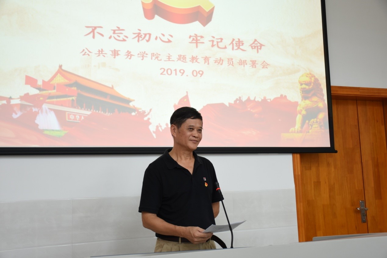 朱仁显院长在主持讲话中指出,全院师生党员要按照党中央、校党委部署要求,依照院党委具体安排,加强前期调研、学习、宣传,为全面开展“不忘初心、牢记使命”主题教育奠定坚实基础。学院将依托主题教育活动,抓严、抓细、抓好、抓出成效,推进我院各项事业发展。