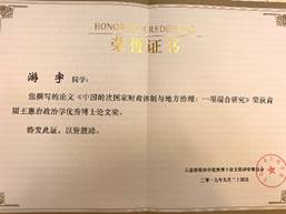 日前,“王惠岩政治学优秀博士论文奖”评审委员会正式公布了首届获奖名单,我院张光教授指导的博士生游宇(现任教于重庆大学公共管理学院)荣获该奖项。2019年9月24日上午,首届王惠岩政治学优秀博士论文奖颁奖典礼暨全国政治学博士生论坛开幕式在吉林大学东荣会议中心报告厅举行。张光教授和游宇博士受邀参加了颁奖典礼和博士生论坛。