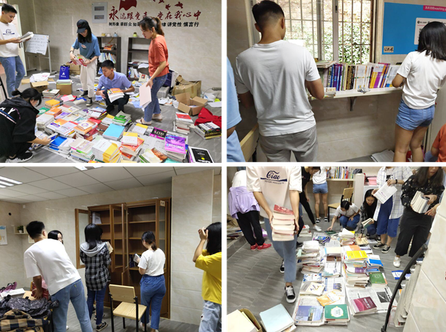 位于芙蓉十三宿舍楼一楼的洗衣房空间大,同时兼顾“党员之家”和自习室的功能,并面向园区同学开放。不少高年级的同学会将不再使用的教科书和教辅书放在洗衣房,供低年级的同学使用。开学一个月来,越来越多的书本被杂乱无章地堆放在地板上落满灰尘,无人问津。为贯彻落实“不忘初心,牢记使命”主题教育为人民群众办实事、办好事的具体要求,在学院党委的大力支持下,学生党支部迅速开展志愿服务活动,对洗衣房两百多本图书及环境卫生进行整理。