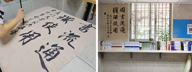 在党员志愿者们集思广益、明确分工,完成了图书整理、卫生清洁、自习室空间重新布置等工作后,洗衣房的环境得到大大改善,自习室呈现焕然一新的景象。为了让更多的同学了解到洗衣房的图书是自由流通,可以循环使用的,党支部书记发挥自身书法特长,书写了“图书流通,循环使用”的宣传标语。同时也张贴了各类书籍分类的标签,以方便高年级的同学按类别合理放置图书与低年级同学取用,让捐赠书籍、图书循环利用的优良传统一直不断延续下去。