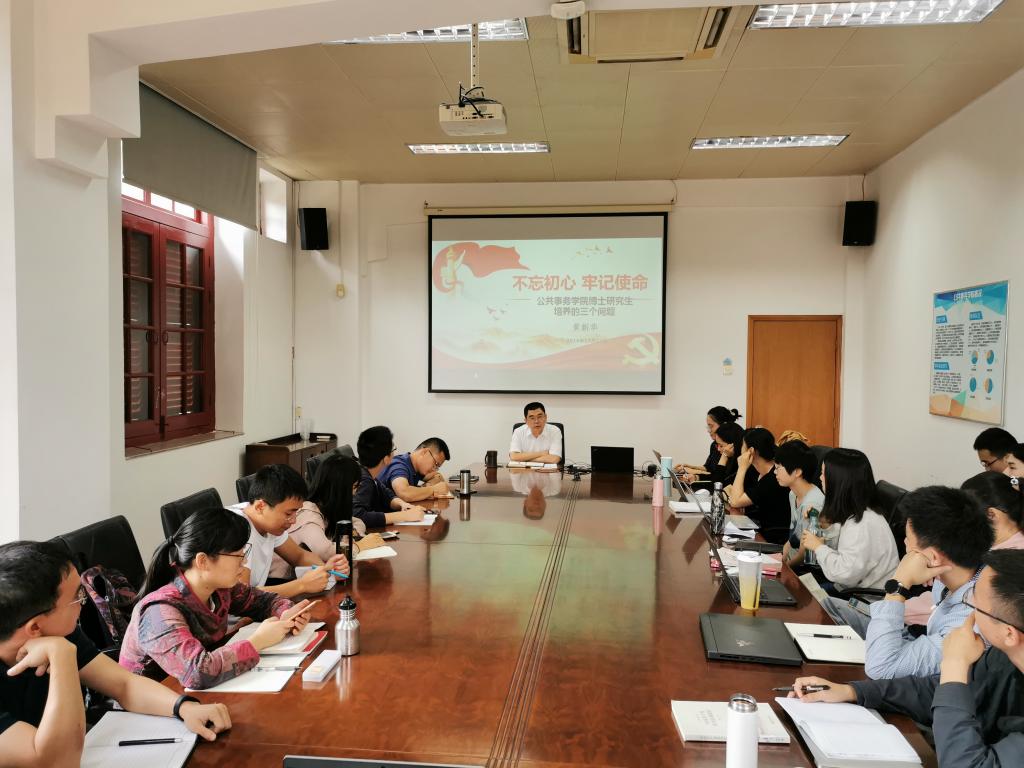 2019年10月29日,公共事务学院党委组织开展了“不忘初心、牢记使命”主题教育之党委书记讲党课活动,公共事务学院党委书记黄新华教授为博士研究生讲述了“公共事务学院博士研究生培养的三个问题”的专题党课,公共事务学院2018级和2019级全体博士研究生参加了此次活动。