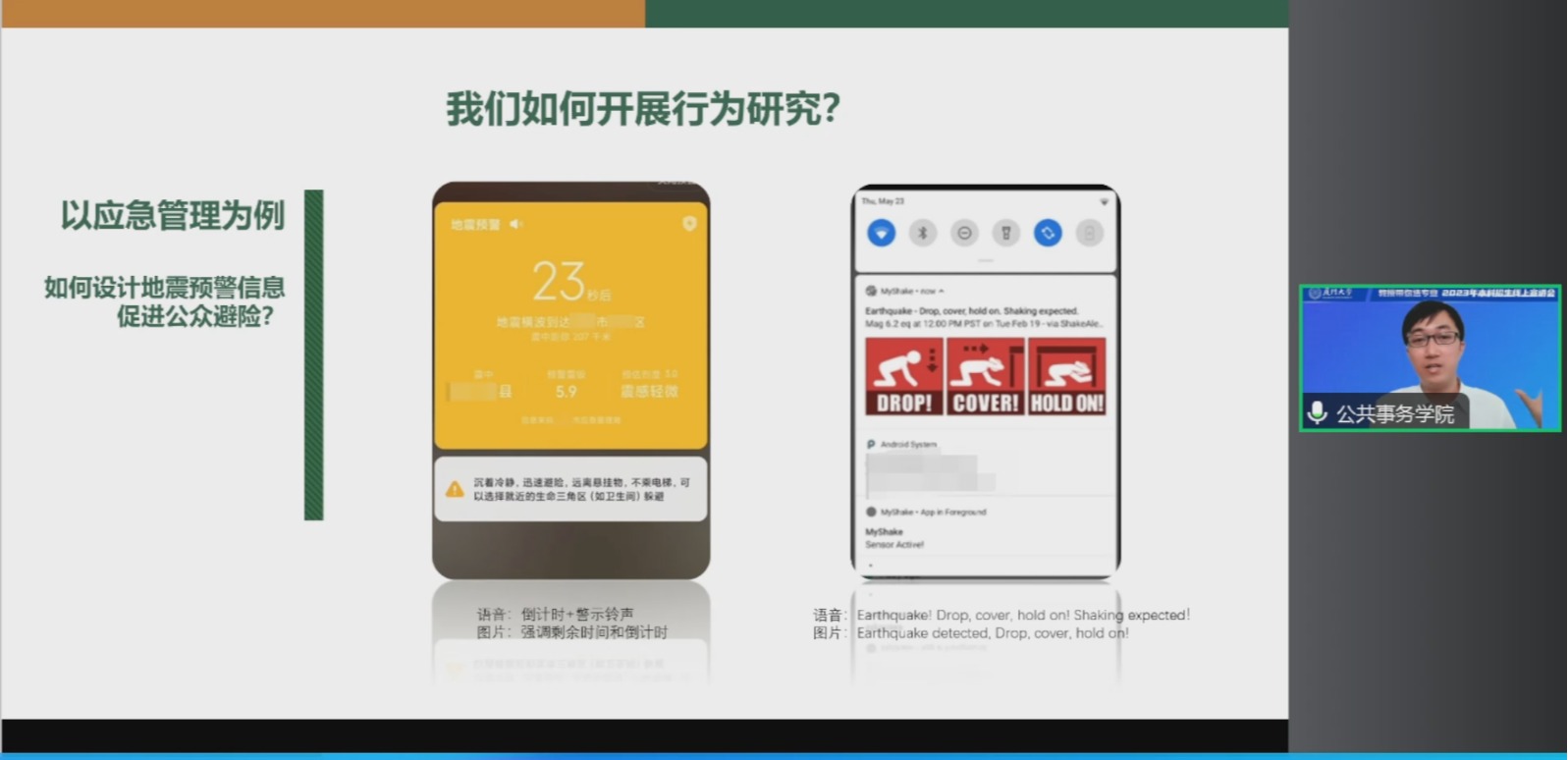 徐浩以行为研究的意义与方法为宣讲内容,并以“如何设计地震预警信息促进公众避险”的研究为例,带领各位考生与家长进一步了解应急管理研究,向各位考生与家长解开了“应急管理创新中的行为‘密码’”。