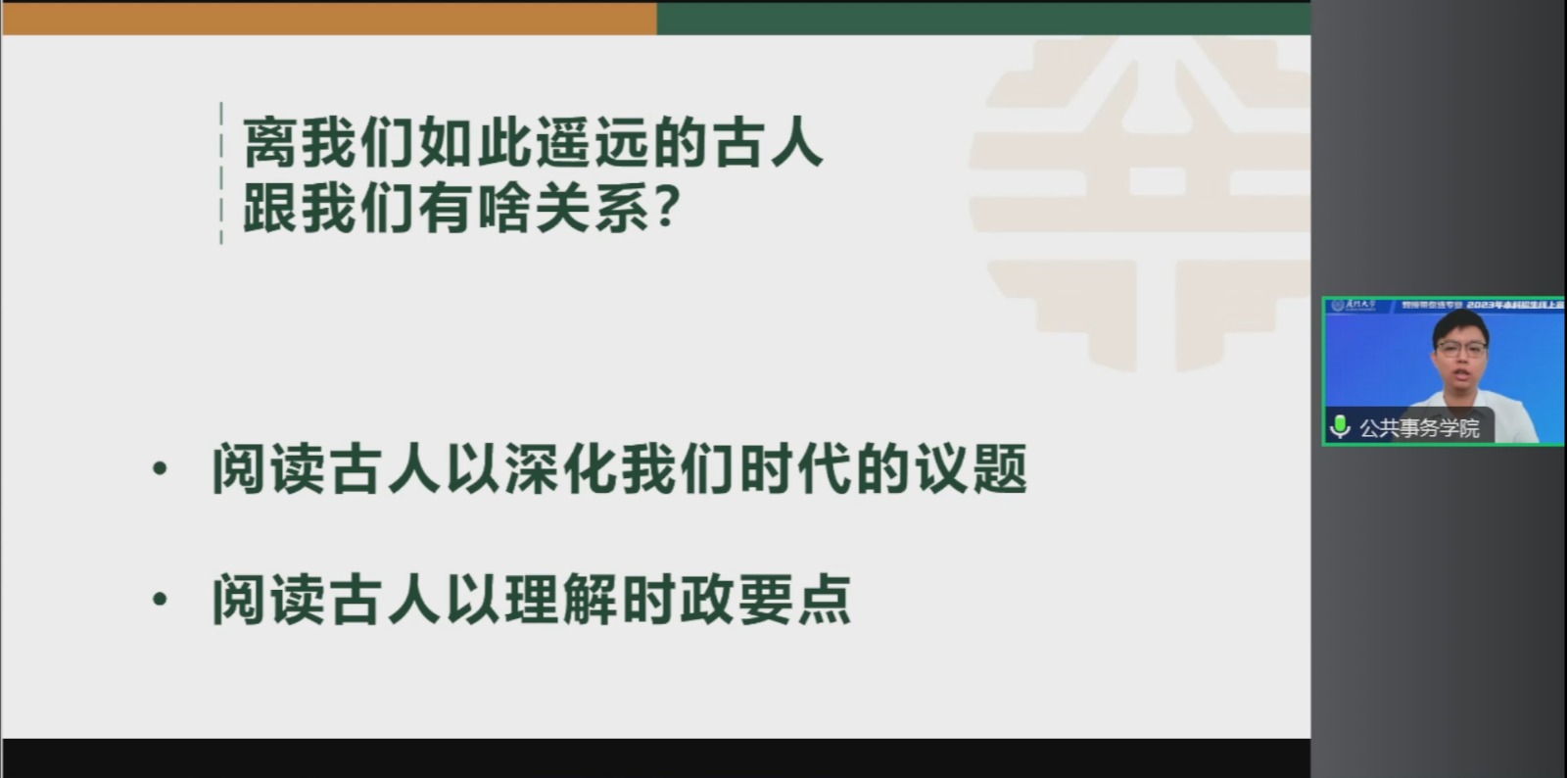 任舒怀从思想史学习的意义与内容开篇,通过热门小说《三体》与热门话题“内卷还是躺平?”,解释了“我们为何仍要阅读古人?”的问题,表示人们可以从政治思想史中汲取智慧解决现实的问题,这也是政治思想史学习的魅力所在。