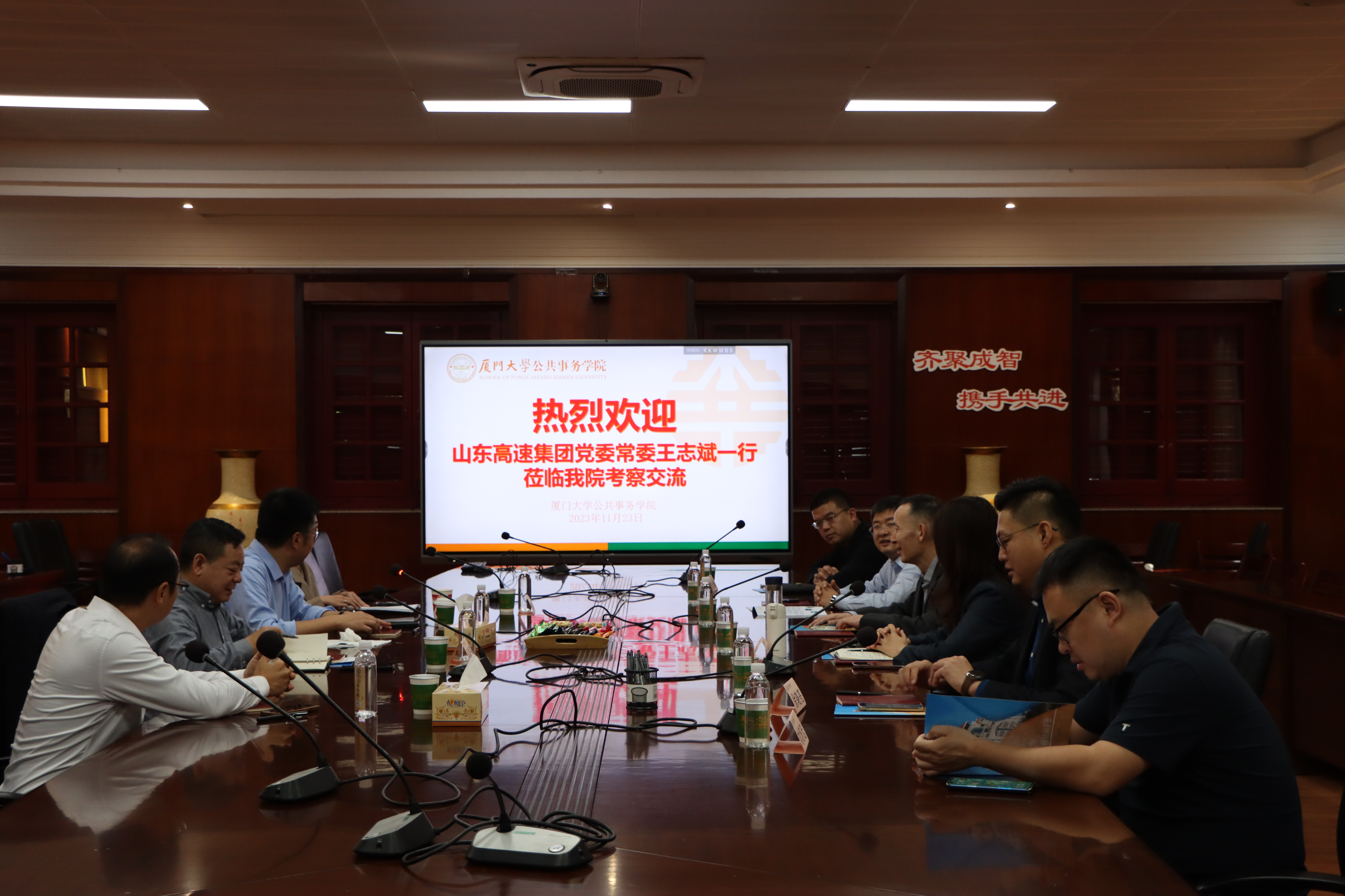 2023年11月23日,山东高速集团党委常委、副总经理王志斌一行访问厦门大学公共事务学院,就人才培养、产融结合等方面举行座谈会。公共事务学院院长于文轩、厦门大学国内合作办副主任吴喜平等领导热情接待了王志斌一行。