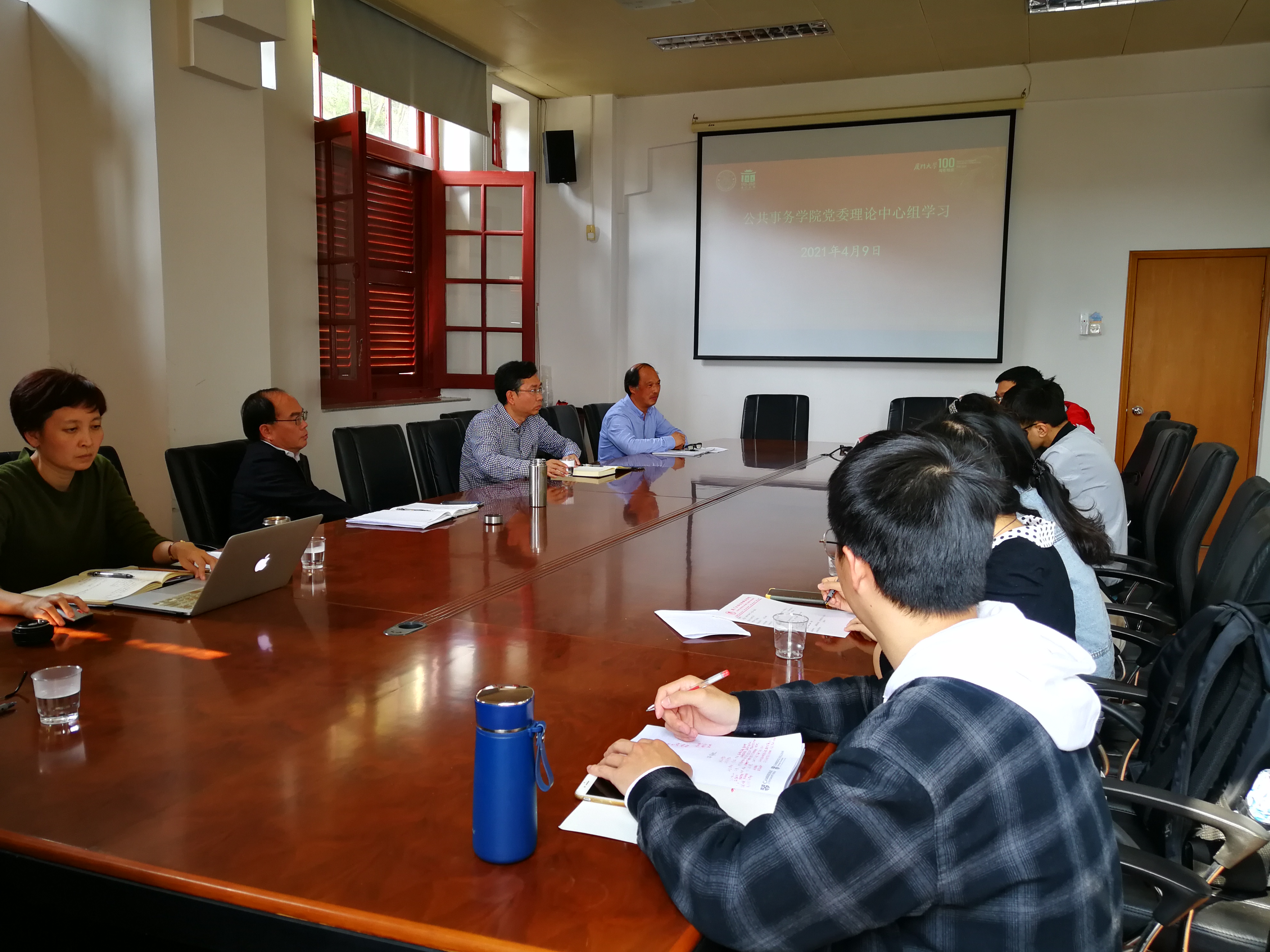 4月9日下午,公共事务学院党委理论学习中心组召开学习(扩大)会议,认真学习传达习近平总书记致厦门大学建校100周年贺信精神。会议由学院党委书记宋友良主持,学院党委理论学习中心组成员、师生党支部书记等参加会议。