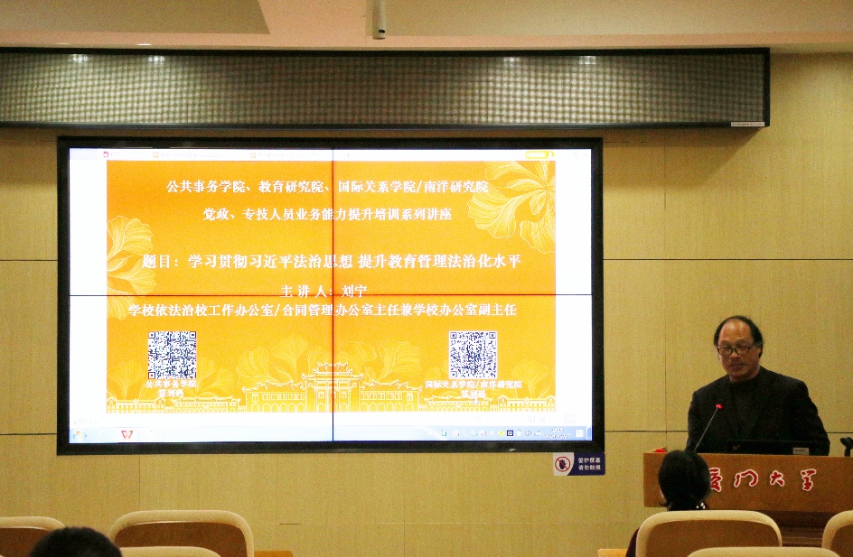 12月27日下午,我院联合教育研究院、国际关系学院/南洋研究院在联兴楼207举办了党政、专技人员业务能力提升培训系列讲座第四讲。本次培训主题是“学习贯彻习近平法治思想,提升教育管理法治化水平”,邀请了学校依法治校工作办公室/合同管理办公室主任兼学校办公室副主任刘宁为三院师生授课。公共事务学院党委副书记林盛铨主持讲座。