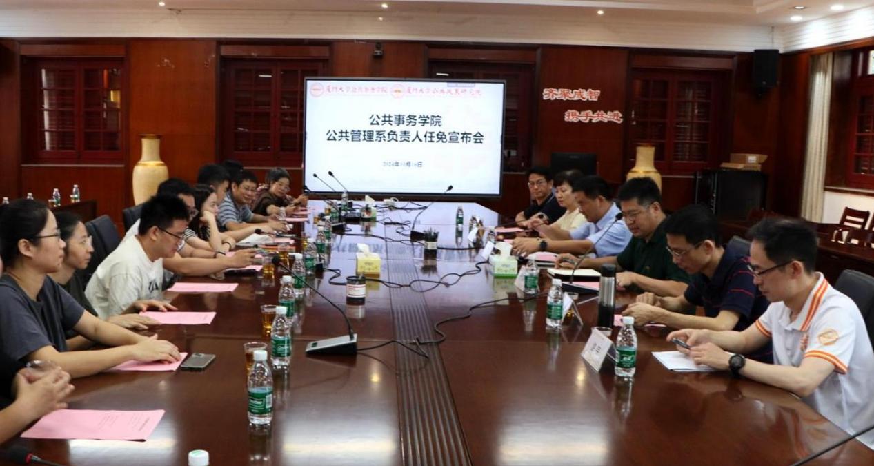 崔庆炜宣读了中共厦门大学委员会文件(厦大委组〔2024〕205号),游宇任厦门大学公共事务学院公共管理系副主任(主持工作);刘建政任厦门大学公共事务学院公共管理系副主任;免去李德国的厦门大学公共事务学院公共管理系副主任(主持工作)职务;免去漆亮亮的厦门大学公共事务学院公共管理系副主任职务。崔庆炜充分肯定了李德国、漆亮亮两位老师在担任着公共管理系负责人期间所取得的成绩,对他们为公共管理系发展的付出、贡献表示感谢,希望他们关心支持帮助新任职的同志。他对新任职的游宇、刘建政两位老师表示祝贺,希望他们转变角色,加强学习,进一步提高站位,把系的各项工作和党建工作、学院中心工作结合起来,凝心聚力,担当作为,带领公共管理系师生创造新业绩、取得新进展。