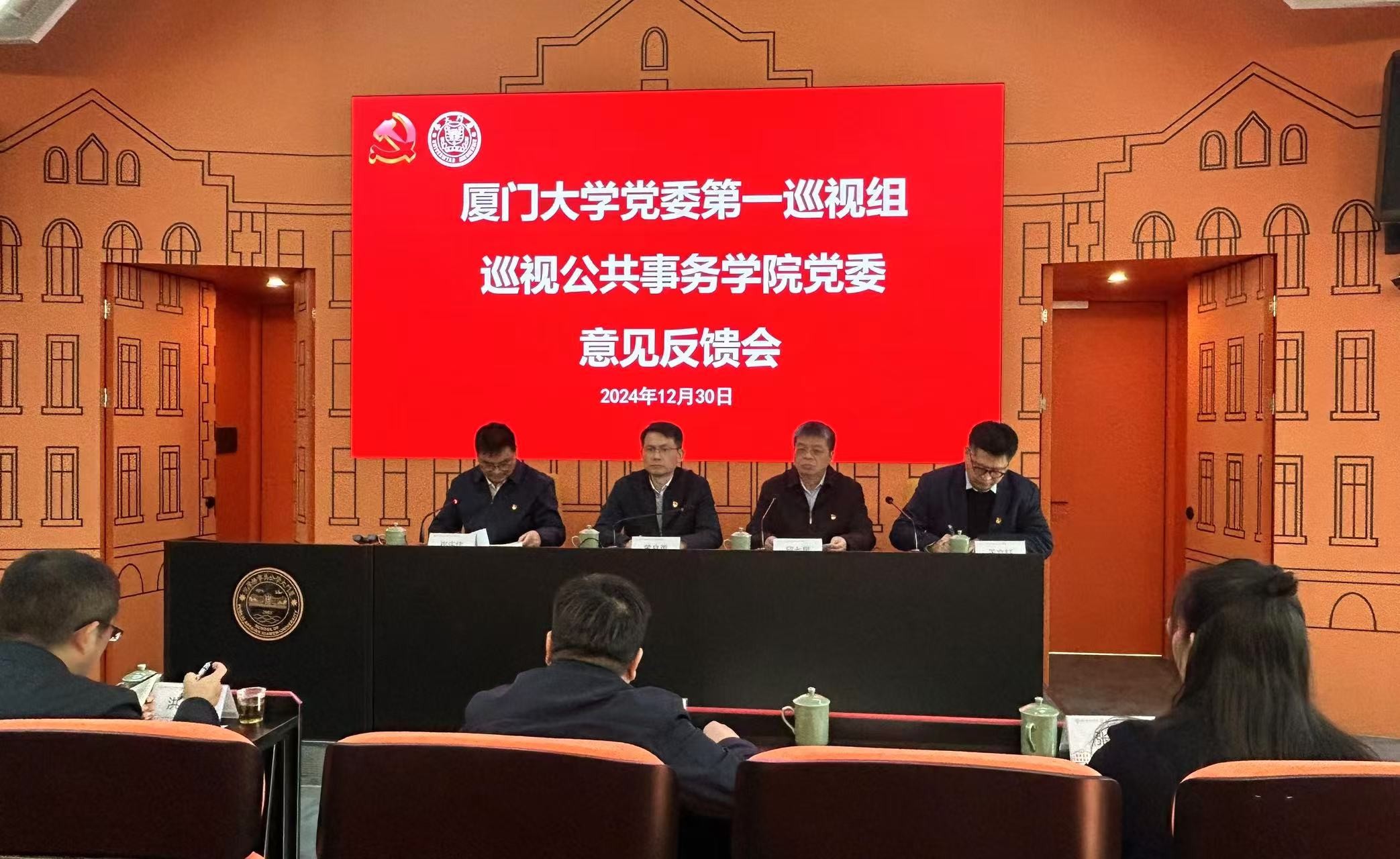 12月30日下午,校党委第一巡视组巡视公共事务学院党委意见反馈会在成智楼324报告厅召开。校党委副书记、纪委书记、国家监委驻厦门大学监察专员黄身勇,校党委第一巡视组组长邱七星和其他成员,校党委巡视办主任洪真裁,校党委党建办主任兼组织部副部长、教师工作部副部长葛郝锐,校纪检监察机构办公室主任林晶等出席会议。公共事务学院党政领导班子以及教职工代表参加会议。会议由公共事务学院党委书记崔庆炜主持。