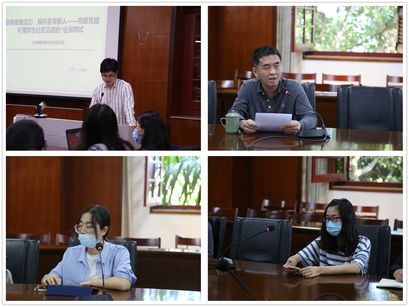 本科党支部书记苏毅辉就入选“福建省新时代党建品牌”的支部项目“尽精微增活力,展形象育新人——构建党建引领学生社区治理的‘近邻模式’”进行分享。他介绍了项目前期的创建过程,从党团共建、共建共治共享的学生社区治理工作体系和后续工作思考三个方面分享了创建经验。