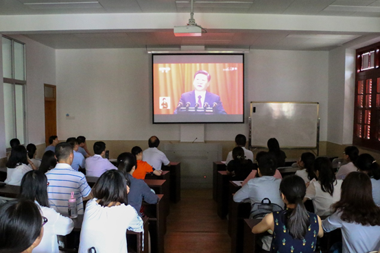 公共事务学院党委组织师生党员代表在成智楼108观看了本次大会的现场直播,引导大家深入学习领会党的十九大精神。学院党委书记刘弢、党委副书记林盛铨一同参与了观看。在观看过程中,大家聚精会神聆听习近平总书记讲话,并不时进行记录,以认真学习贯彻落实好党的十九大精神。通过观看党的十九大开幕会,大家切实感受到了国家五年来发生的巨大变化,切身体会到共产党领导下的新中国在新时期、新阶段所取得的辉煌成就,内心备受鼓舞,信念也随之更加坚定。大家纷纷表示要在今后的学习与工作中,更加自觉坚定地同党中央保持高度一致,为新时代中国特色社会主义建设贡献自己的一份力量。