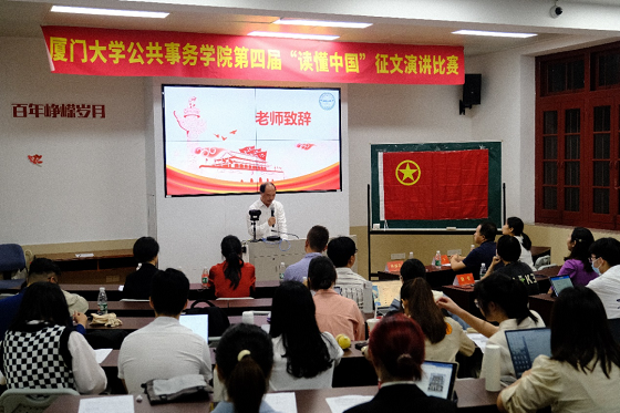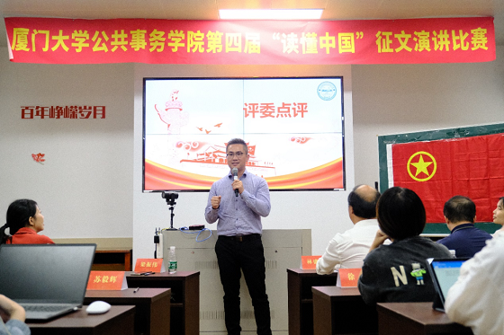 为促进青年学生深入学习十九届六中全会精神和习近平总书记在庆祝中国共青团成立100周年大会上的重要讲话精神,迎接党的二十大胜利召开,使更多大学生深切感悟中国共产党的历史担当,坚定听党话、跟党走的信念与决心,按照学校开展“四史”教育活动的工作要求,厦门大学公共事务学院5月27日晚在成智楼108成功举办第四届“读懂中国”征文演讲比赛。校团委副书记梁振伟、信息学院团委副书记刘茜、建筑与土木工程学院团委副书记林婕、外文学院团委副书记蔡宇、学生工作部(处)教育科谢婷婷等五位老师担任现场评委,公共事务学院党委副书记林盛铨、学工组徐莹、苏毅辉、李思颖等老师出席。