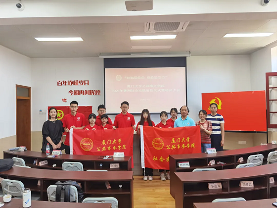 为深入学习宣传贯彻习近平新时代中国特色社会主义思想,贯彻落实习近平总书记关于青年工作的重要思想,引导和帮助广大青年学生上好与现实相结合的“大思政课”,引导青年师生在观察实践中学党史、强信念、跟党走,今年以庆祝中国共产党成立100周年、厦门大学成立100周年为契机,以“永远跟党走,奋进新时代”为主题,公共事务学院2021年暑期社会实践出征仪式暨动员大会于7月14日中午12:00在成智一108举行。党委副书记林盛铨,政治学系副系主任、社会实践指导教师代表林雪霏,团委副书记蒋慧琼,辅导员李思颖及各实践队代表出席出征仪式。