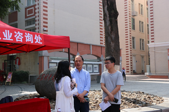 招聘幕后,离不开学院老师的辛勤指导,谆谆教诲。招聘会现场设置了就业咨询处,公共事务学院老师们为前来应聘的学生们提供就业咨询并指导学生进行简历修改。此外,老师们也深入了解现场招聘情况,与用人单位和前来应聘的学生进行亲切交流,并对学院的就业服务工作提出具体指导意见。