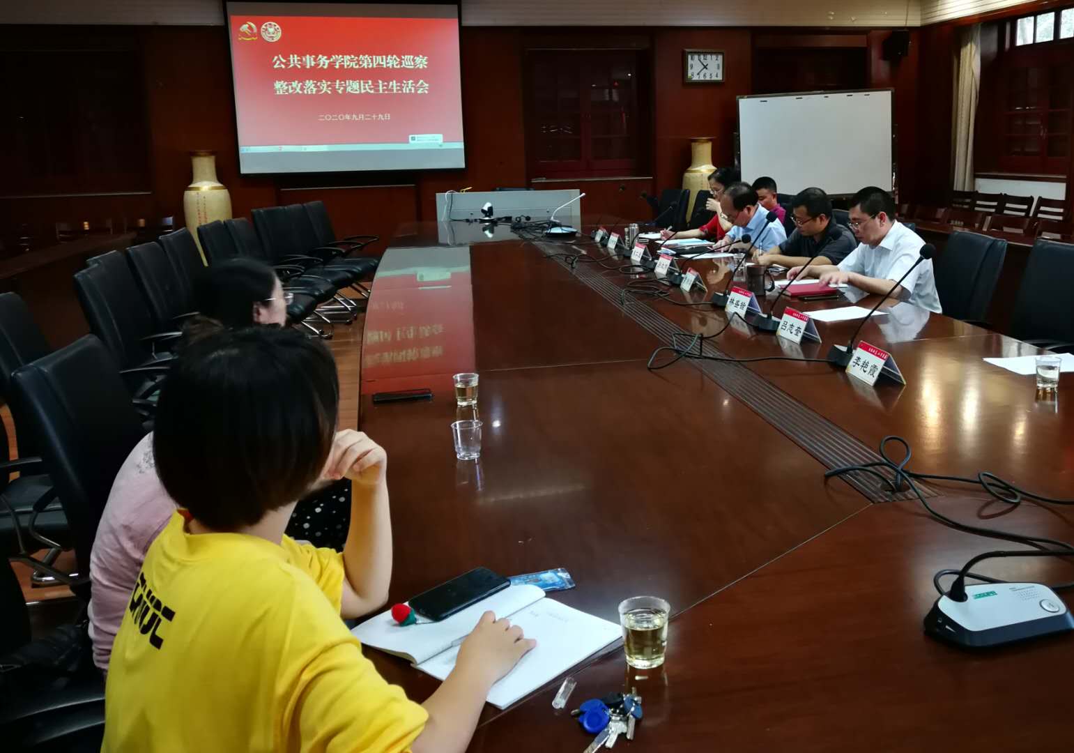 2020年9月29日下午,公共事务学院党委召开巡察反馈意见整改落实专题民主生活会。校党委第四巡察组成员房太伟同志到会指导,公共事务学院党政领导班子成员参加会议,各系负责人、教工党支部书记、团委书记、党务秘书等有关同志按要求列席会议。会议由学院党委书记黄新华主持。