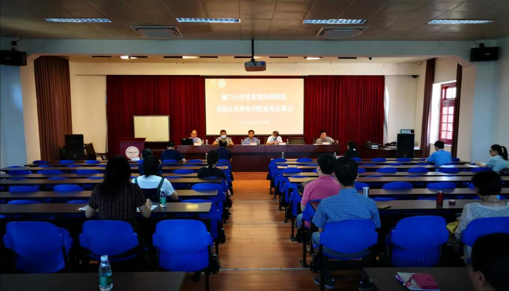 7月24日上午,厦门大学党委第四巡察组巡察公共事务学院党委意见反馈会在成智楼324报告厅召开。校党委第四巡察组组长、医学院党委书记、医科建设与管理办公室主任张建安同志,副组长、生命科学学院原党委书记黄田同志,校党委巡察工作领导小组办公室副主任洪真裁同志出席了会议。大会由公共事务学院院长朱仁显主持,学院党政领导班子成员,全体教职工及离退休同志代表共60多人参加了会议。会前,党委第四巡察组向我院党政主要负责同志反馈了巡察情况,学院党政主要负责同志签收了反馈意见。