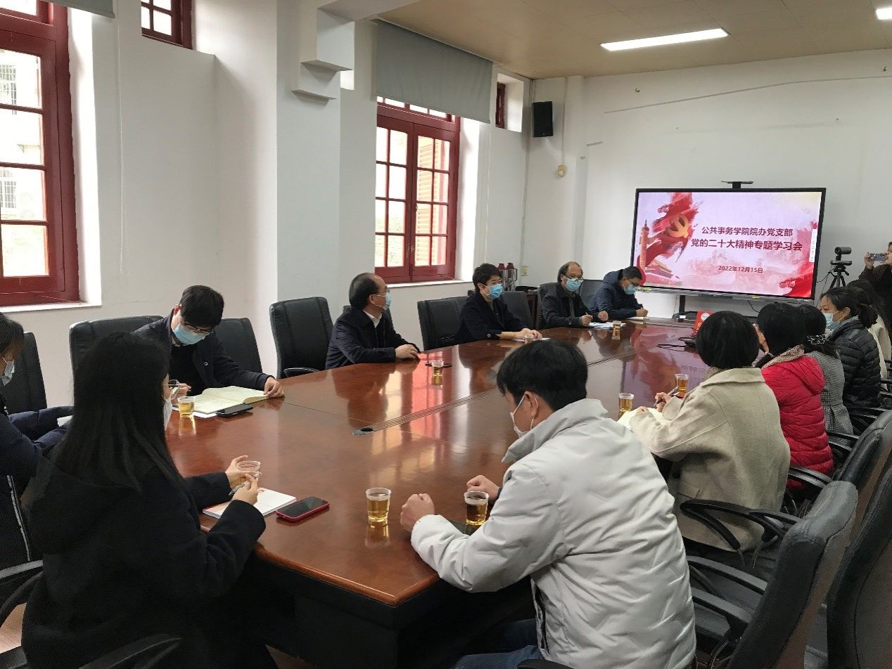 12月16日中午,公共事务学院院办党支部在成智楼221会议室举办党的二十大精神专题学习会,朱仁显院长、院办支部党员、办公室非党员同志参与此次会议。