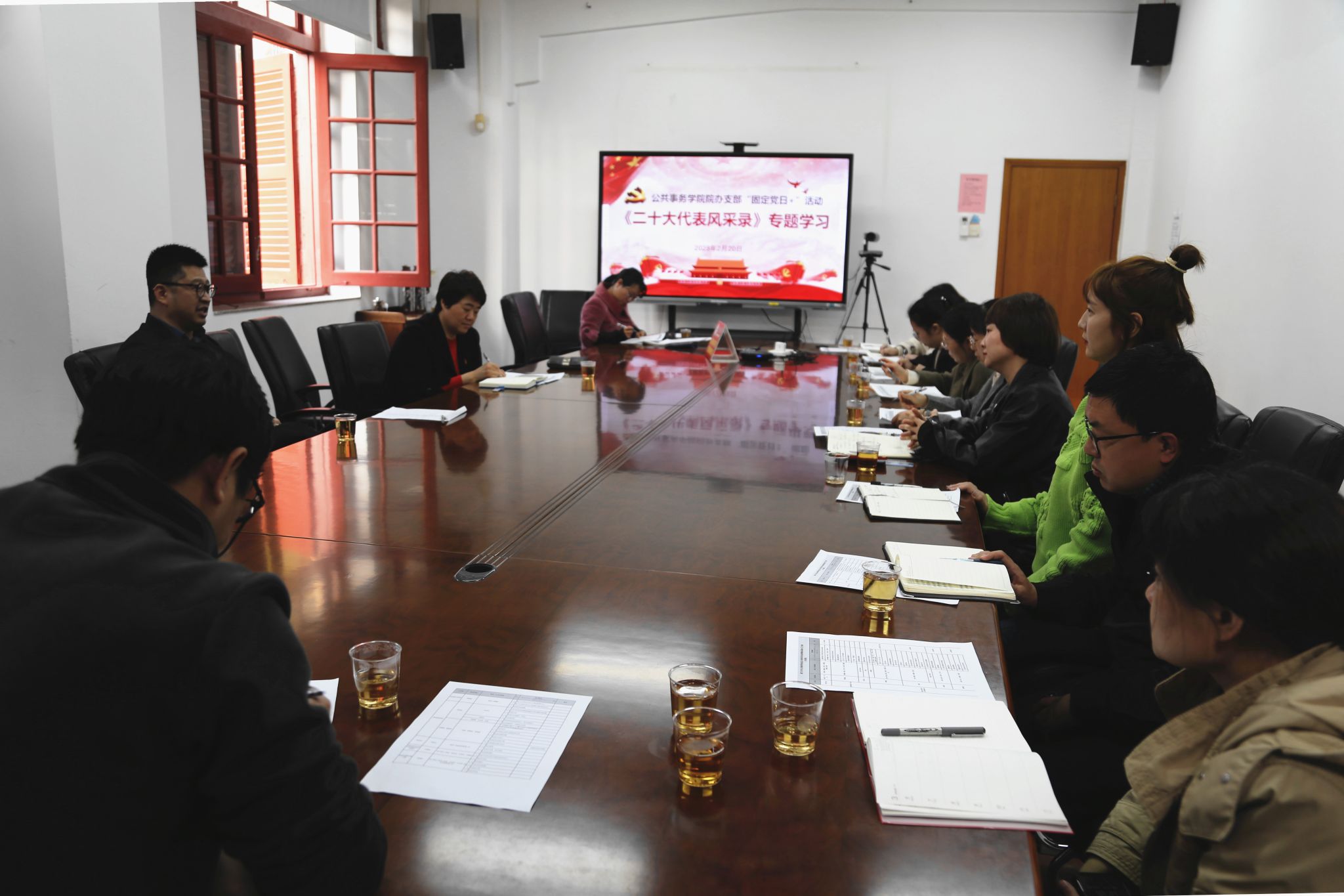 2月20日下午,公共事务学院院办党支部在成智楼221会议室开展《二十大代表风采录》专题学习活动,院长于文轩教授、院办党支部全体成员、办公室非党员同志参与此次活动。