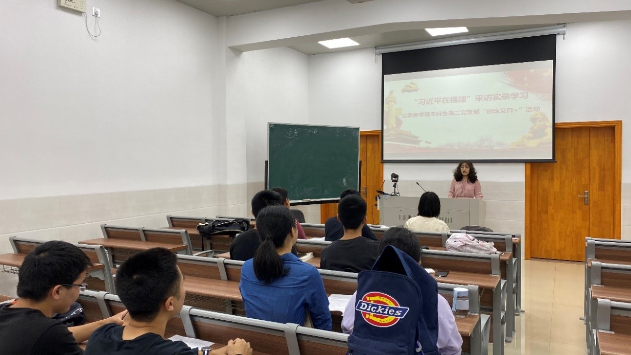 2020年10月30日,公共事务学院本科生第二党支部在成智一103教室举办了以学习“习近平在福建”采访实录学习活动。公共事务学院本科生第二党支部全体党员参与了此次活动。支部书记赖丽琴主持了本次活动。