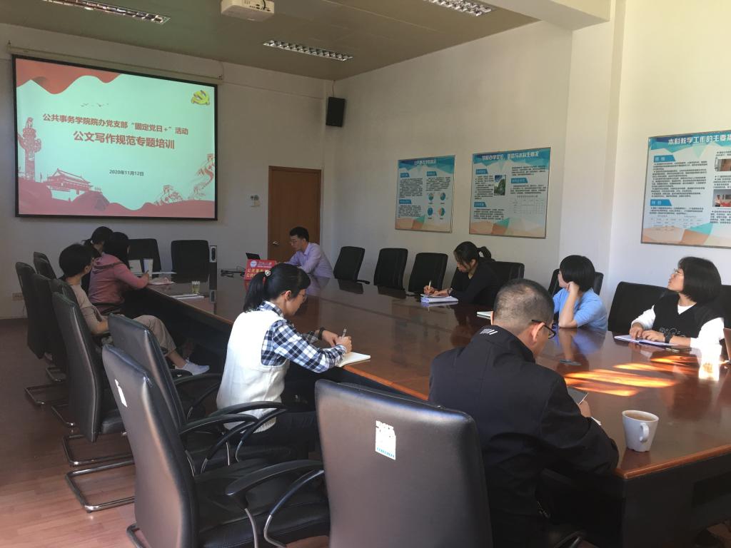 11月12日中午,2020年11月12日中午,公共事务学院院办党支部在成智楼221会议室举办以《公文写作规范专题培训》为主题的“固定党日+”活动,邀请学校办公室秘书蒲晓业老师做分享,蒲晓业老师以《公文与公文写作》为题为支部成员做专题讲授。