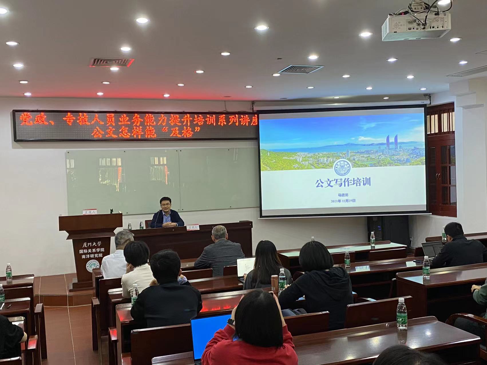 11月29日下午,系列讲座的第一讲邀请了厦门大学办公室副主任马进龙老师以《公文怎样能“及格”》为题,畅谈公文写作“及格”方法,为三院党政、专技人员上了一堂内容详实、精彩生动的公文写作课。讲座由教育研究院党委姚有新副书记主持。