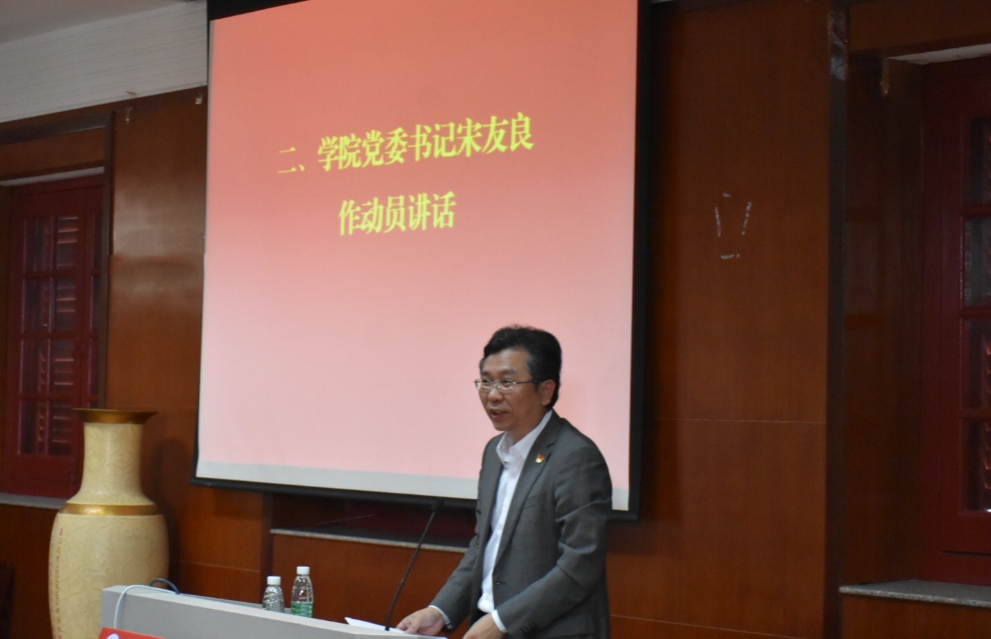 学院党委书记宋友良作动员讲话。他指出,在全党开展党史学习教育,是党中央立足党的百年历史新起点、统筹中华民族伟大复兴战略全局和世界百年未有之大变局、为动员全党全国满怀信心投身全面建设社会主义现代化国家而作出的重大决策。全体师生员工要提高政治站位,深刻认识开展党史学习教育的重大意义,切实把思想和行动统一到习近平总书记在党史学习教育动员大会上的重要讲话精神上来,以高度的政治自觉、思想自觉和行动自觉开展党史学习教育;把握工作重点,切实做到“六个进一步”;明确目标要求,紧紧围绕“学党史、悟思想、办实事、开新局”十二个字总体要求,真正做到学史明理、学史增信、学史崇德、学史力行;做到有序推进,按照既定的工作安排,按时有序推动党史学习教育扎实开展;发挥学院优势,鼓励师生围绕中国共产党成立100周年深入开展理论研究和宣传阐释;坚持学做结合,深入开展“我为群众办实事”实践活动,把学习党史同解决问题、推动工作结合起来,让师生群众感受到学习教育带来的新变化新气象。