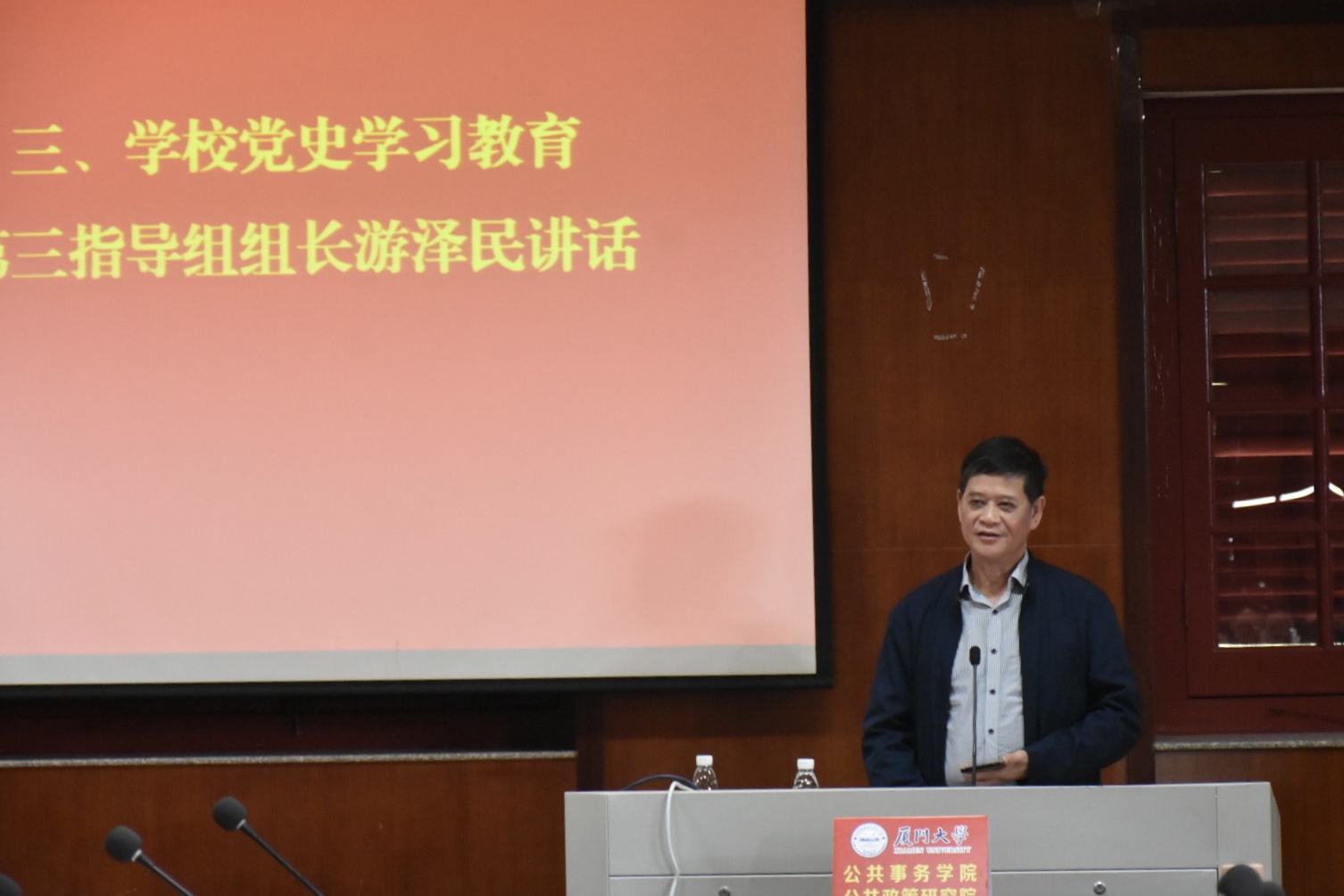 游泽民传达了中央和校党委党史学习教育有关精神,并代表校党委对学院开展党史学习教育提出三点要求:一要提高政治站位,深化思想认识,切实增强开展好党史学习教育的责任感和使命感;二要坚持目标导向,突出重点任务,确保党史学习教育取得实实在在的成效;三要强化主体责任,认真组织领导,以严的作风保障党史学习教育顺利开展。他希望,公共事务学院党委在学校党委的坚强领导下,扎实开展工作,确保党史学习教育取得好的效果,推动学院各项事业取得新的进展。
