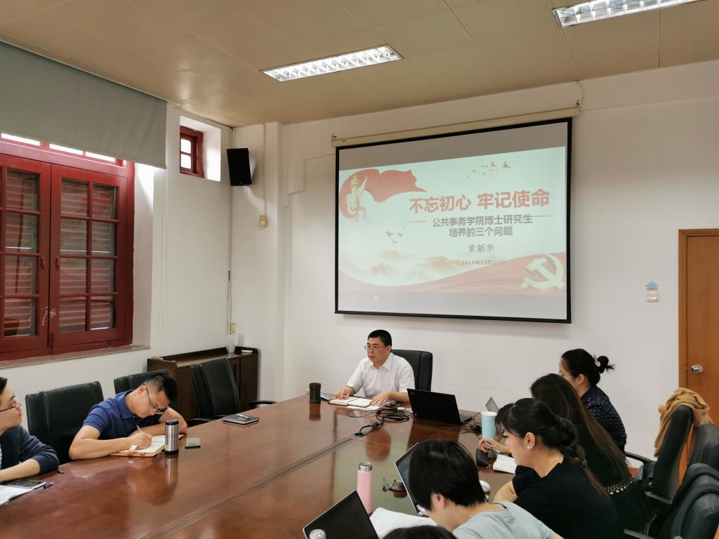 2019年10月29日,公共事务学院党委组织开展了“不忘初心、牢记使命”主题教育之党委书记讲党课活动,公共事务学院党委书记黄新华教授为博士研究生讲述了“公共事务学院博士研究生培养的三个问题”的专题党课,公共事务学院2018级和2019级全体博士研究生参加了此次活动。