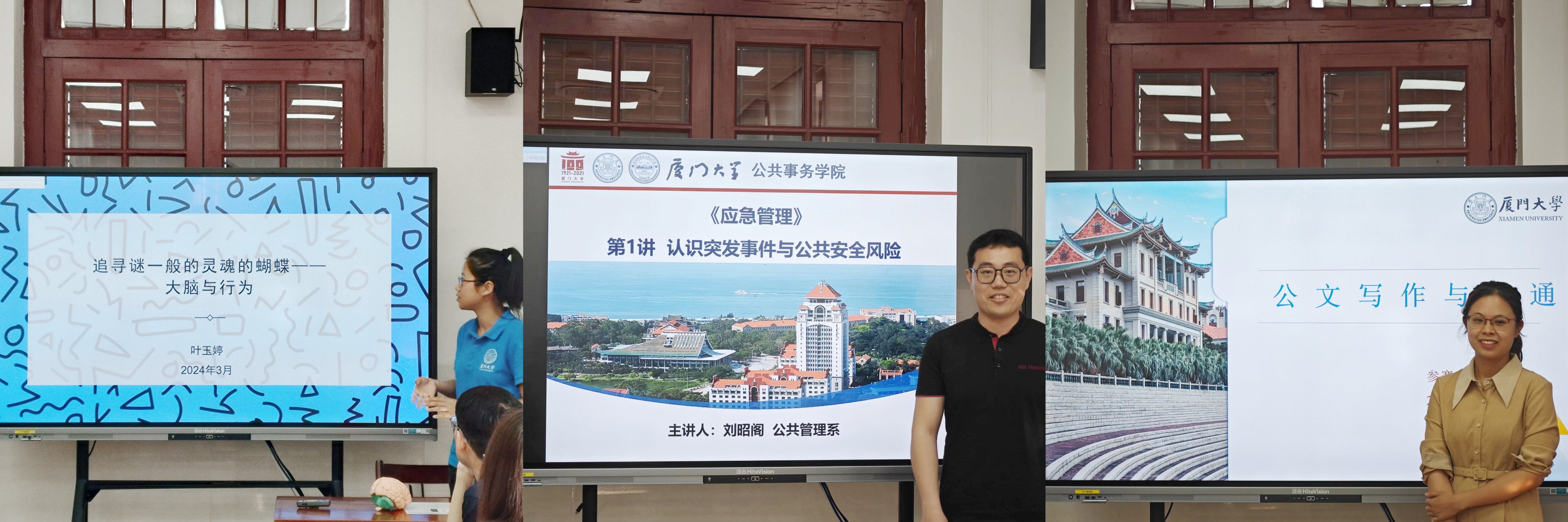 叶玉婷老师以“追寻谜一般的灵魂蝴蝶——大脑与行为”为主题,系统地介绍了历史上关于心智的生理基础之争,并以通俗易懂的语言深入浅出地介绍了大脑的功能特性以及人类对其所进行的科学探索历程;刘昭阁老师以“认识突发事件与公共安全风险”为主题,通过当下流行的电影、电视剧引出突发事件的定义,形象化地展示了突发事件的五大特征,并介绍了突发事件如何进行分级、分期处置;张婷敏老师以“公文写作与沟通”为主题,围绕公文的产生与发展、作用与影响、定义与分类三个方面,结合生动案例,进行课程导论内容介绍,帮助大家认识公文、了解公文,提升对公文写作学习的兴趣。