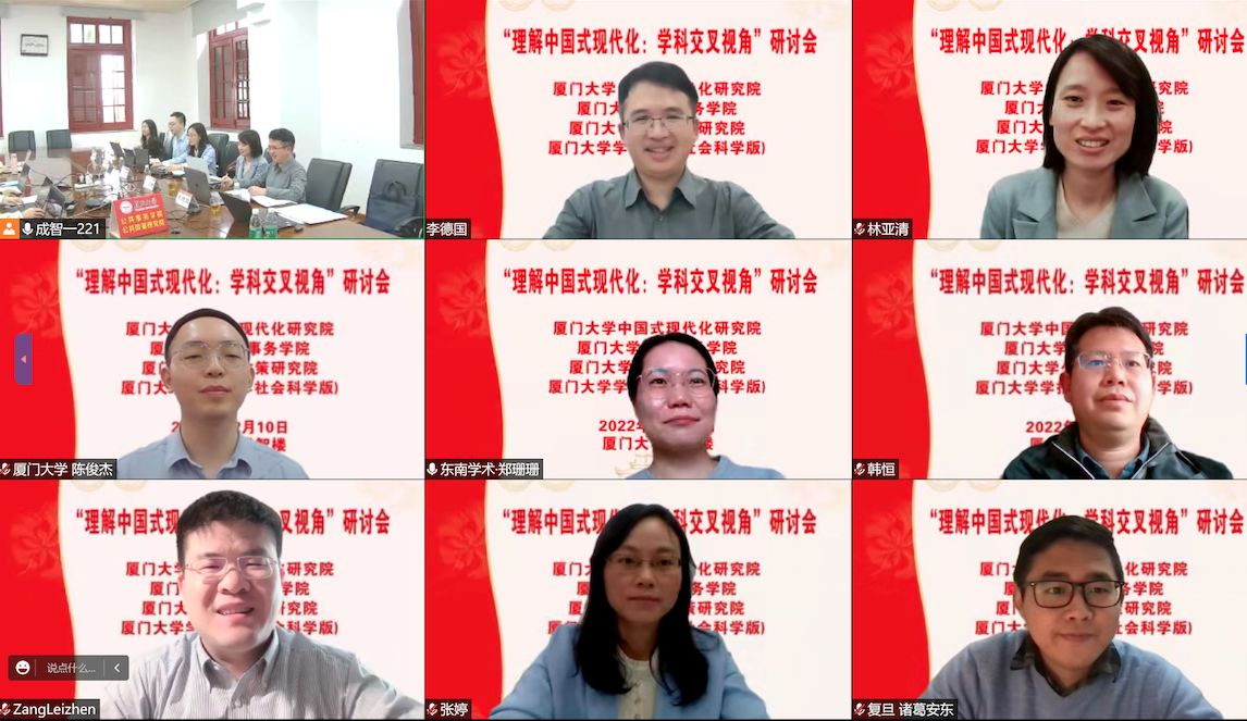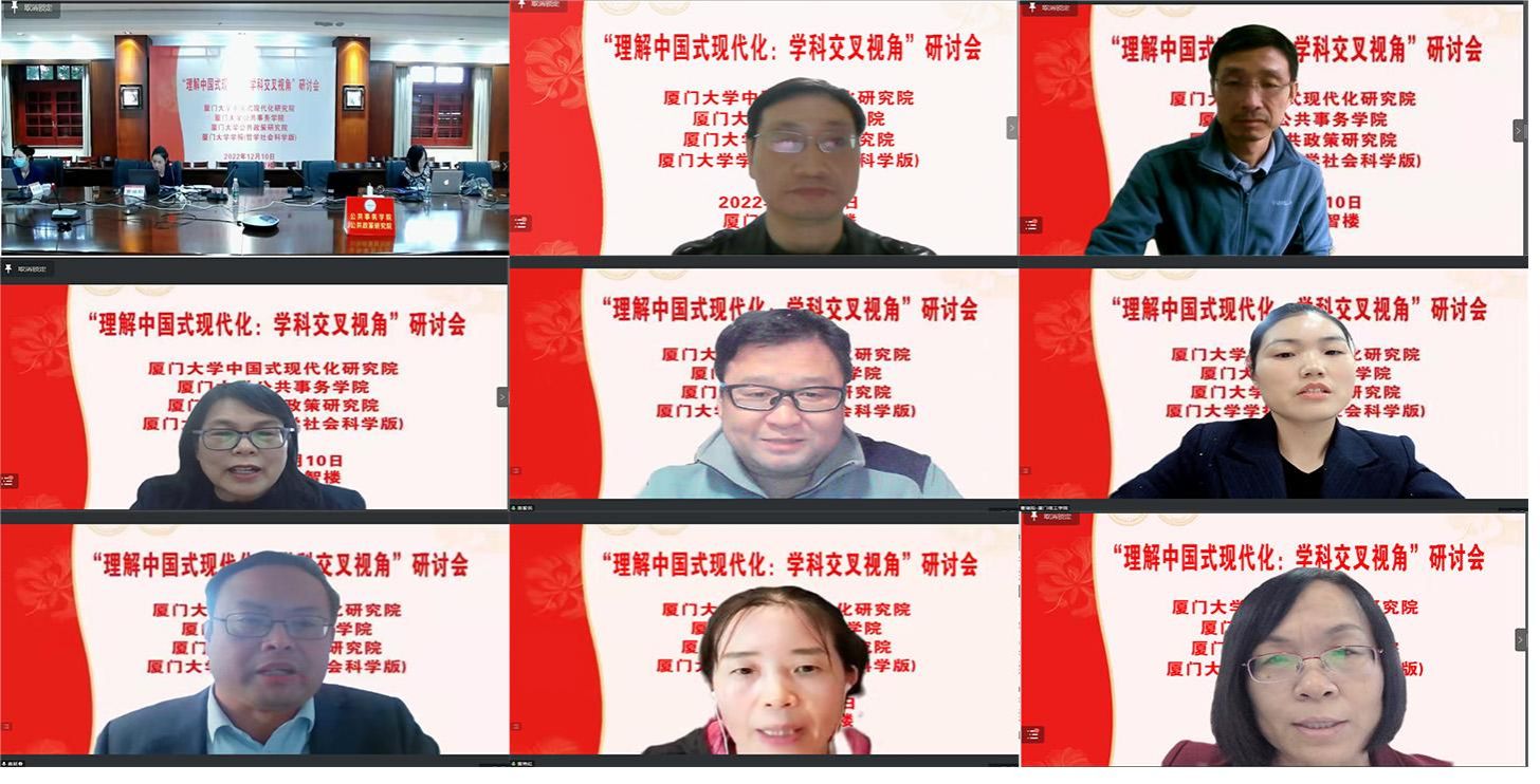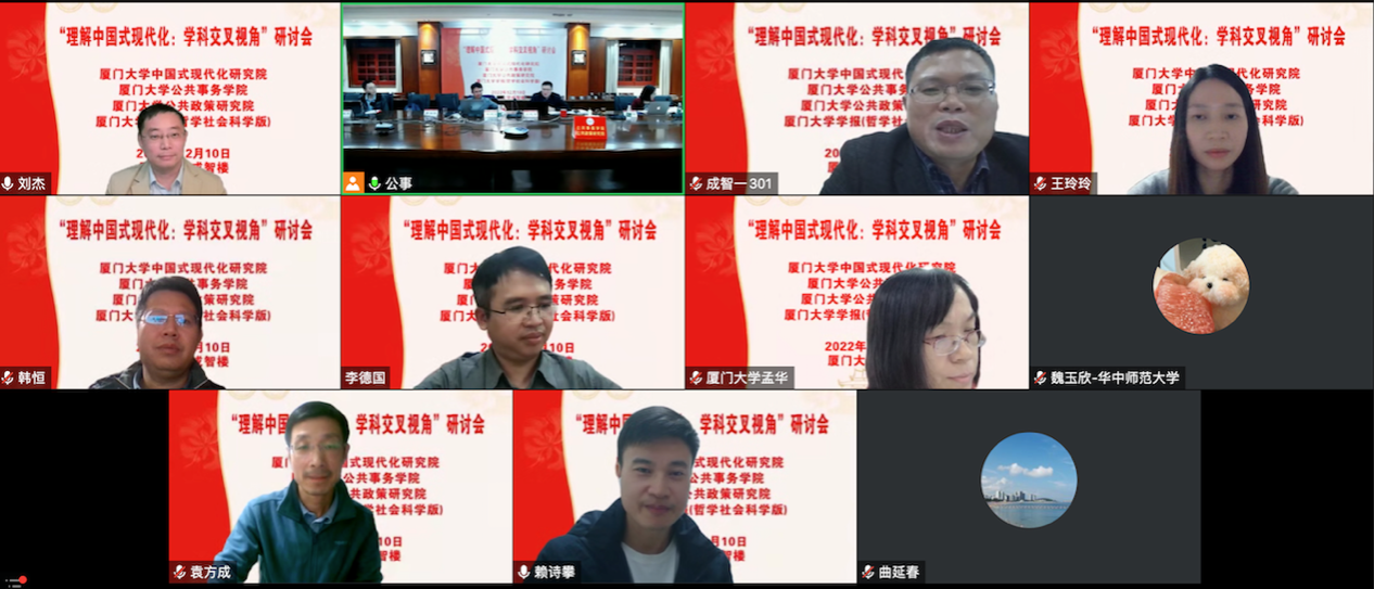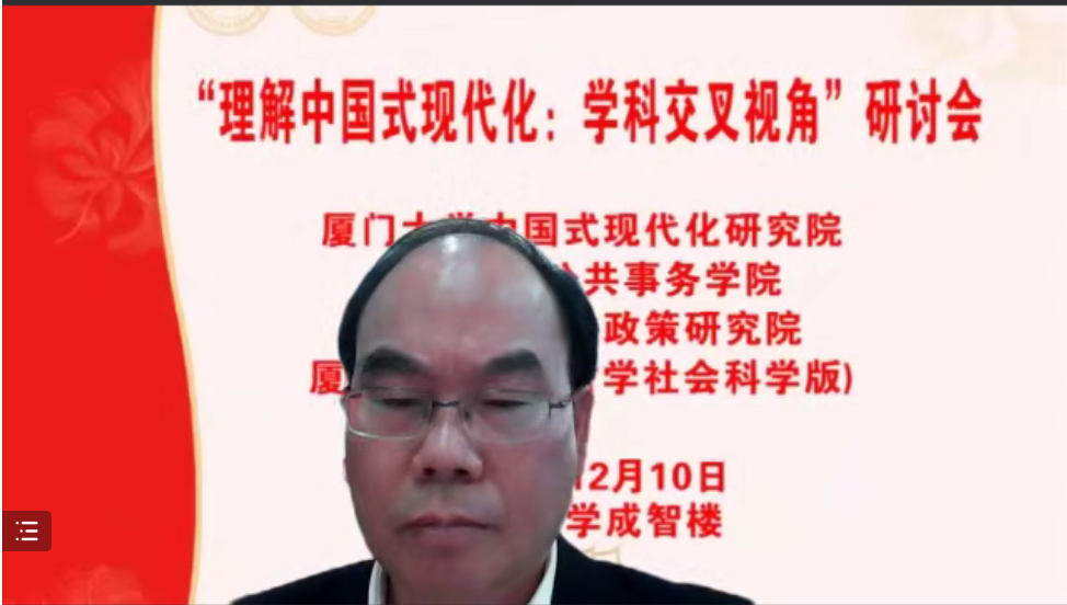 党的二十大报告指出:中国式现代化,是中国共产党领导的社会主义现代化,既有各国现代化的共同特征,更有基于自己国情的中国特色。为深入学习贯彻党的二十大精神,全面阐释中国式现代化的深度实践,由厦门大学中国式现代化研究院、厦门大学公共事务学院、公共政策研究院与厦门大学学报 (哲学社会科学版)联合主办的“理解中国式现代化: 学科交叉视角”学术研讨会,于12 月 10 日在厦门大学召开。会议采用线上线下相结合的形式,来自清华大学、中国人民大学、上海交通大学、复旦大学、南京大学、南开大学、武汉大学、中国农业大学、华中师范大学、郑州大学和厦门大学等机构的专家学者和学生,以及《厦门大学学报(哲学社会科学版)》《中国高校社会科学》《福建论坛》《东南学术》《中国行政管理》《北京行政学院学报》《广西师范大学学报》《新视野》等杂志社的多位编辑参与了会议。研讨会开幕式由厦门大学公共事务学院院长朱仁显教授主持。