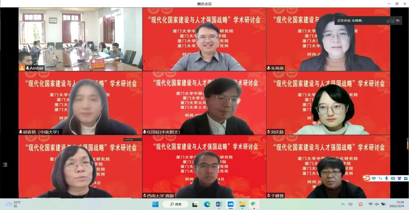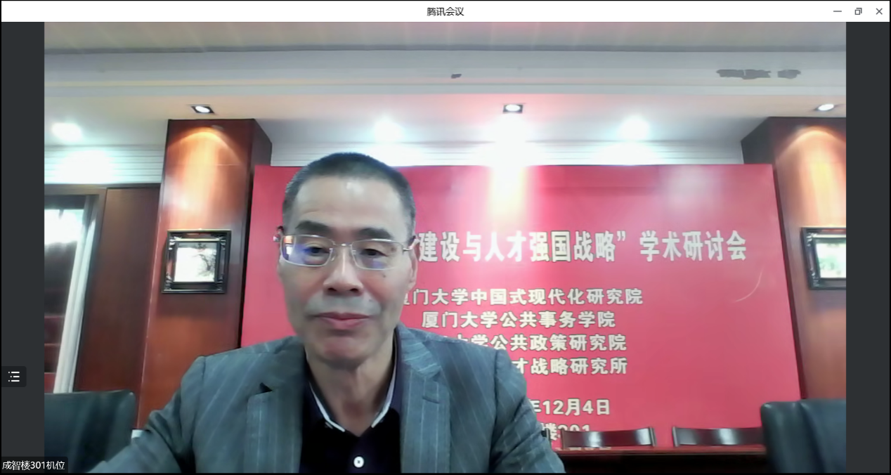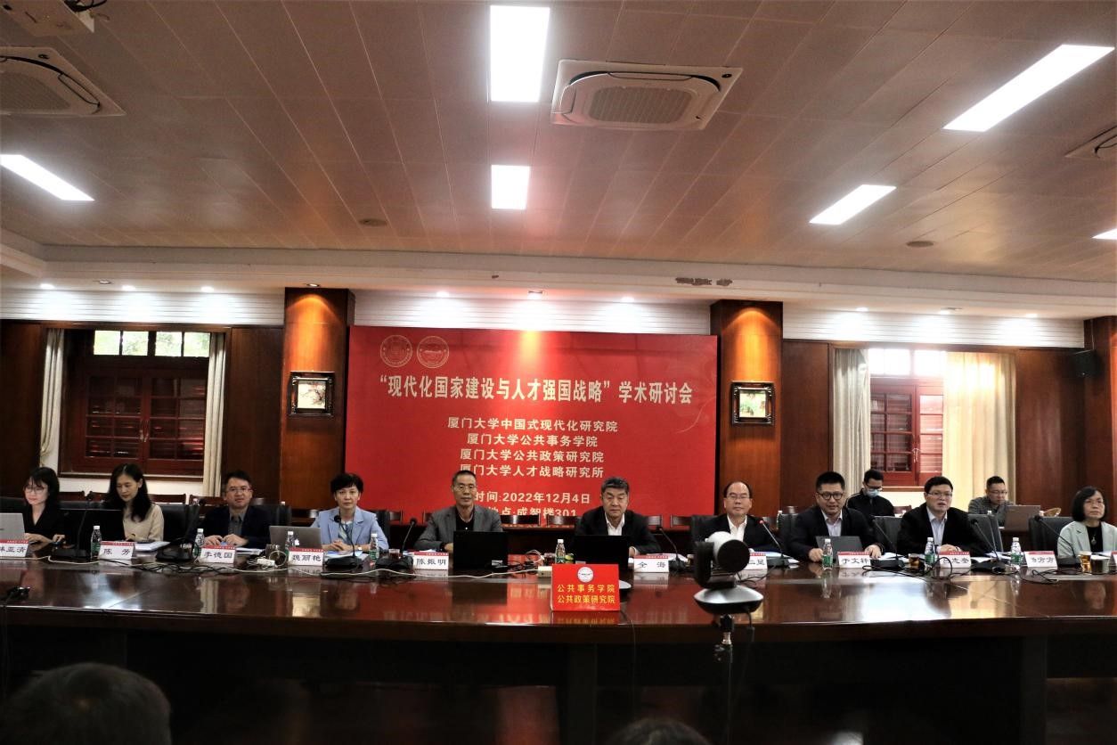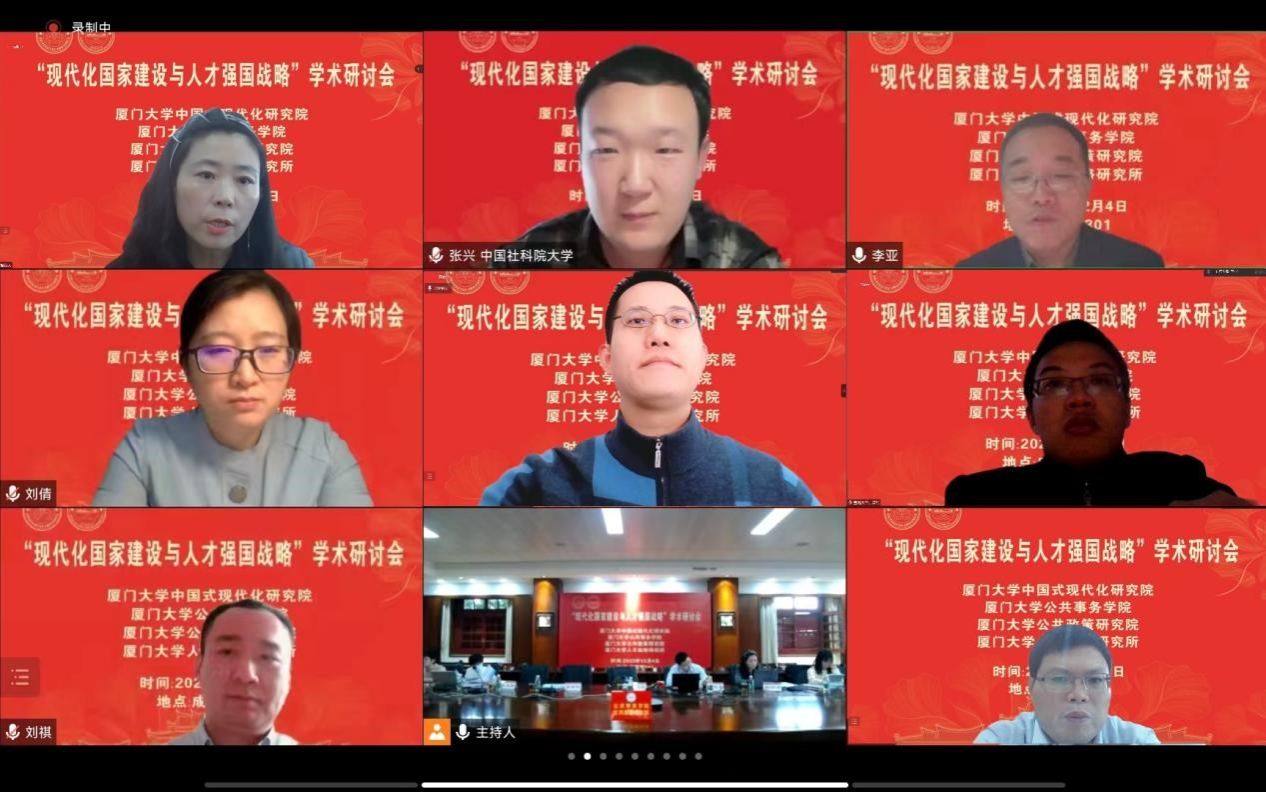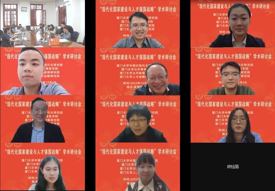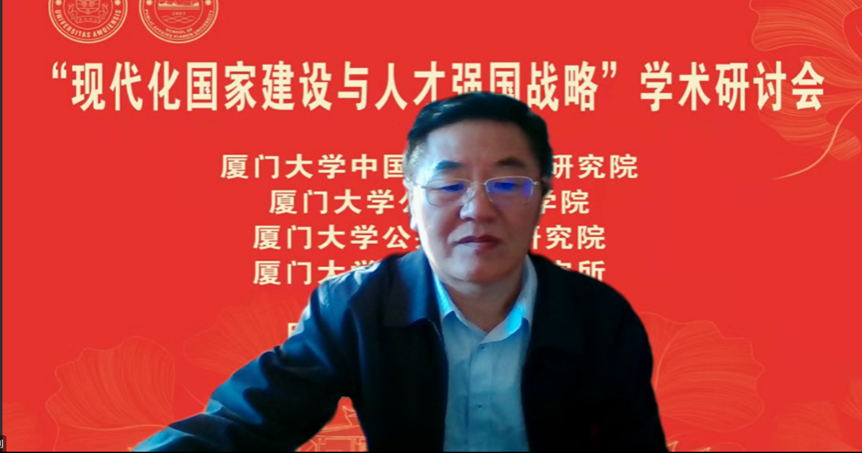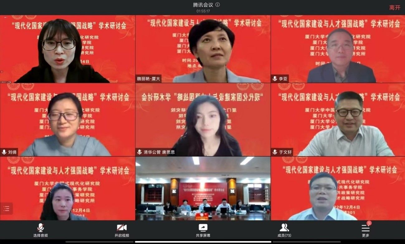 党的二十大报告指出:“教育、科技、人才是全面建设社会主义现代化国家的基础性、战略性支撑。深入实施科教兴国战略、人才强国战略、创新驱动发展战略”。为学习贯彻党的二十大精神,由厦门大学“公共治理”“双一流”学科建设项目、国家社科基金重大项目“强化制度执行力研究”支持,厦门大学中国式现代化研究院、厦门大学公共事务学院、厦门大学公共政策研究院与福建省高校特色新型智库—厦门大学人才战略研究所联合举办的“现代化国家建设与人才强国战略”学术研讨会于12月4日采用线上线下结合形式在厦门大学召开。来自中央党校(国家行政学院)、中国人事科学研究院、清华大学、北京大学、中国人民大学、武汉大学、上海交通大学、北京航空航天大学、新加坡南洋理工大学、澳门城市大学、厦门大学、中国社会科学、中国行政管理、公共行政评论、行政论坛、中国人民大学出版社等单位的近70位专家学者参加了研讨。厦门大学党委副书记、纪委书记全海教授出席研讨会开幕式并致辞。研讨会开幕式由厦门大学公共事务学院院长朱仁显教授主持。