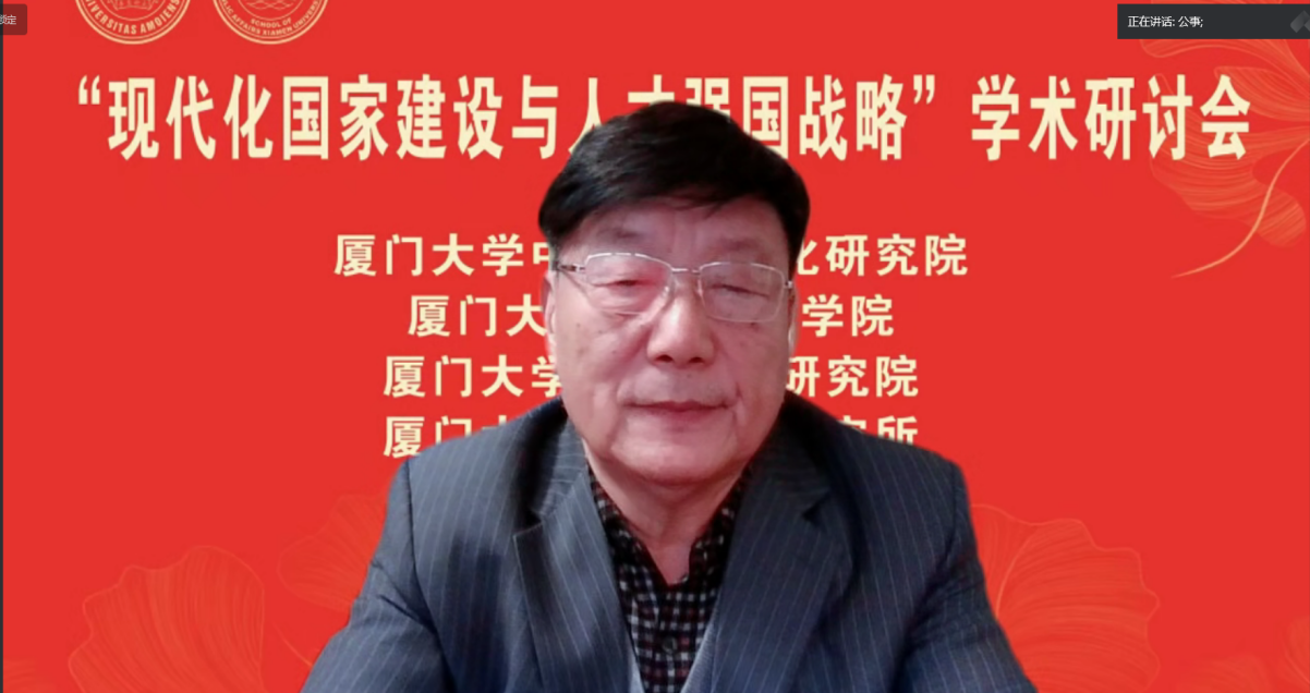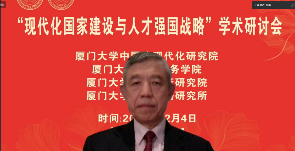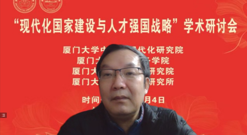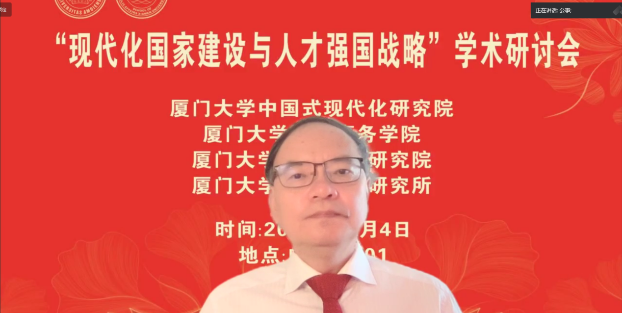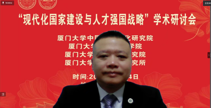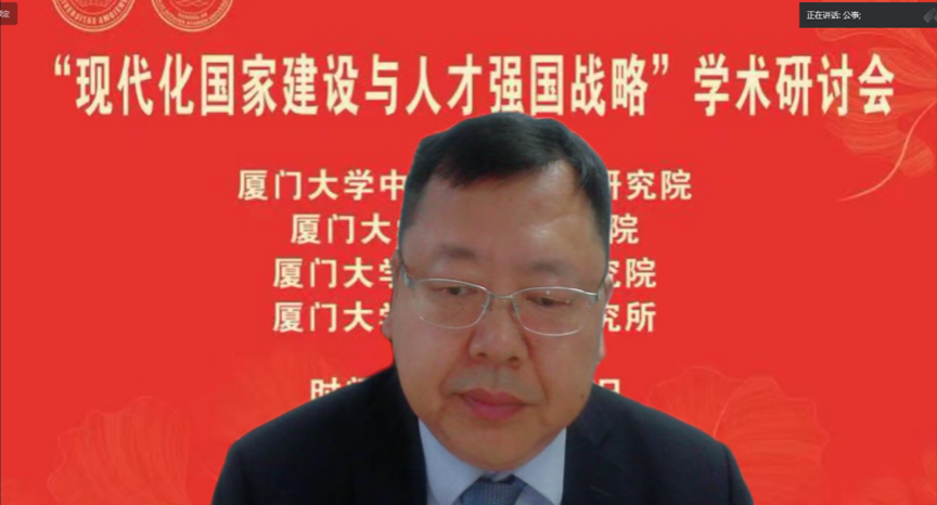 厦门大学党委副书记、纪委书记全海教授在致辞中指出,党的二十大报告强调加快建设教育强国、科技强国、人才强国。人才强国战略在全面建设社会主义现代化国家新征程中的具有基础性战略性地位,这次研讨会聚焦于我国现代化国家建设和人才强国战略实施这一主题,可谓恰逢其时,意义重大。在党的二十大刚闭幕的10月25日,厦门大学就成立了中国式现代化研究院。这是我校贯彻落实党的二十大精神、全面提升服务区域发展和国家战略能力的重要举措。要不断提升服务国家重大战略需求的能力和水平,在科教兴国战略、人才强国战略、创新驱动发展战略中担当作为、奋发有为,为中国式现代化贡献厦大力量。他希望通过本次研讨会的交流,产生真知灼见,为深入理解、准确把握、全面贯彻党的二十大精神,为深入实施人才强国战略贡献思想力量。