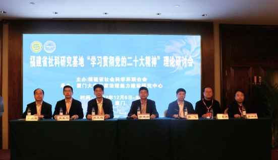 12月7日,由福建省社科联主办、厦门大学国家治理能力建设研究中心承办的福建省社科研究基地“学习贯彻党的二十大精神”理论研讨会在厦门召开。本次研讨会采用线上线下相结合的形式举行,由厦门大学公共事务学院院长朱仁显教授发表开幕致辞,并主持主旨发言。来自17家基地依托单位的领导、29家省社科研究基地专家以及相关科研管理部门的领导100多人参加了会议。福建省社科联兼职副主席、厦门大学党委副书记徐进功、省社科联党组成员、秘书长陈飞出席开幕式并致辞。