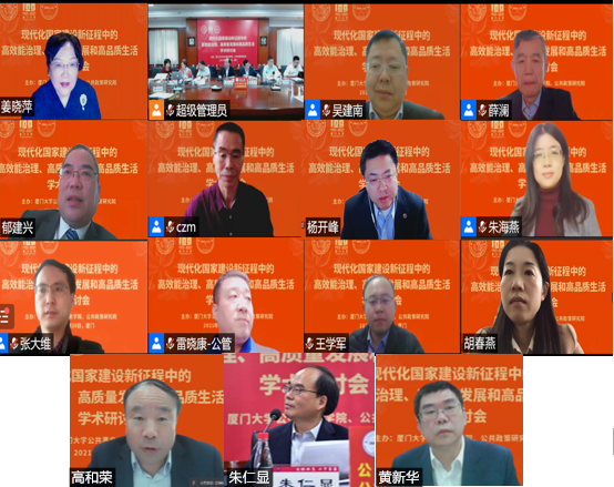 为深入学习领会和贯彻落实习近平总书记“七一”重要讲话精神和党的十九届六中全会精神,由厦门大学“公共治理”双一流学科建设项目、国家社科基金重大项目“强化制度执行力研究”支持,厦门大学公共事务学院、公共政策研究院主办的“现代化国家建设新征程中的高效能治理、高质量发展和高品质生活”学术研讨会于2021年11月20日在厦门大学顺利召开。本次会议采用线上线下相结合的形式,来自清华大学、中国人民大学、浙江大学、上海交通大学、四川大学、兰州大学、重庆大学、中南大学、西北大学、华中师范大学、华侨大学和厦门大学等高校的专家学者,以及中国人民大学出版社、新华文摘杂志社、中国社会科学杂志社、中国行政管理杂志社、中国人民大学学报杂志社、中国高校社会科学杂志社、行政论坛杂志社、学术研究杂志社、东南学术杂志社和福建日报社等报刊的主编、编审或编辑近百人参加了此次研讨会,线上观看人数近两千人。