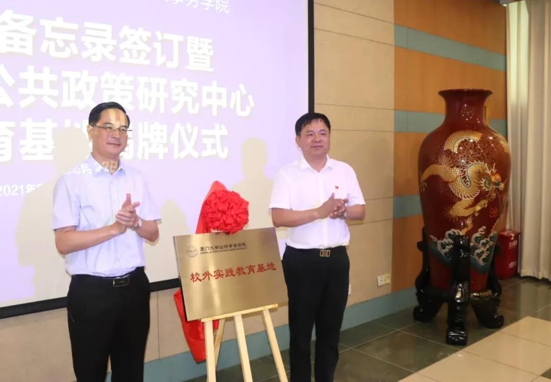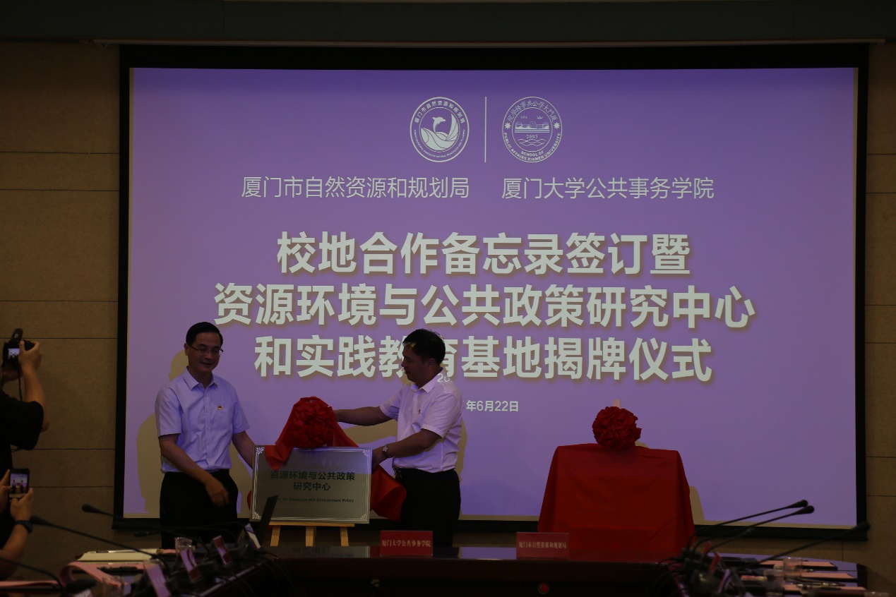 邱伟杰和柯玉宗共同为“资源环境与公共政策研究中心”和“厦门大学公共事务学院校外实践教育基地”揭牌。