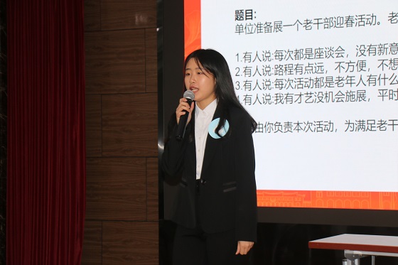 第三环节,每位选手随机抽取一道模拟公务员面试的题目进行作答。面试题目紧紧围绕公务员的日常工作,探讨了工作过程中可能遇到的行政事务解决、人际关系冲突、突发情况应变等高度情景化的问题,引导同学们了解、关注并熟悉公务员的日常工作状况,思考其承担的责任与应具备的品质,为日后进入公务员队伍工作做好准备、打好基础。选手们在短短的三分钟内梳理作答思路,迅速组织好语言,从容不迫、自信满满地阐述自己的观点,赢得台下观众的阵阵掌声。