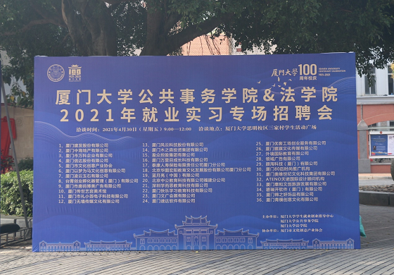 为实现人才供需的有效对接,搭建企业、高校、毕业生之间的就业沟通交流平台,促进2021届未就业毕业生早就业、就好业,4月30日上午,由厦门大学公共事务学院联合法学院举办“2021就业实习专场招聘会”在三家村学生活动广场圆满举行!