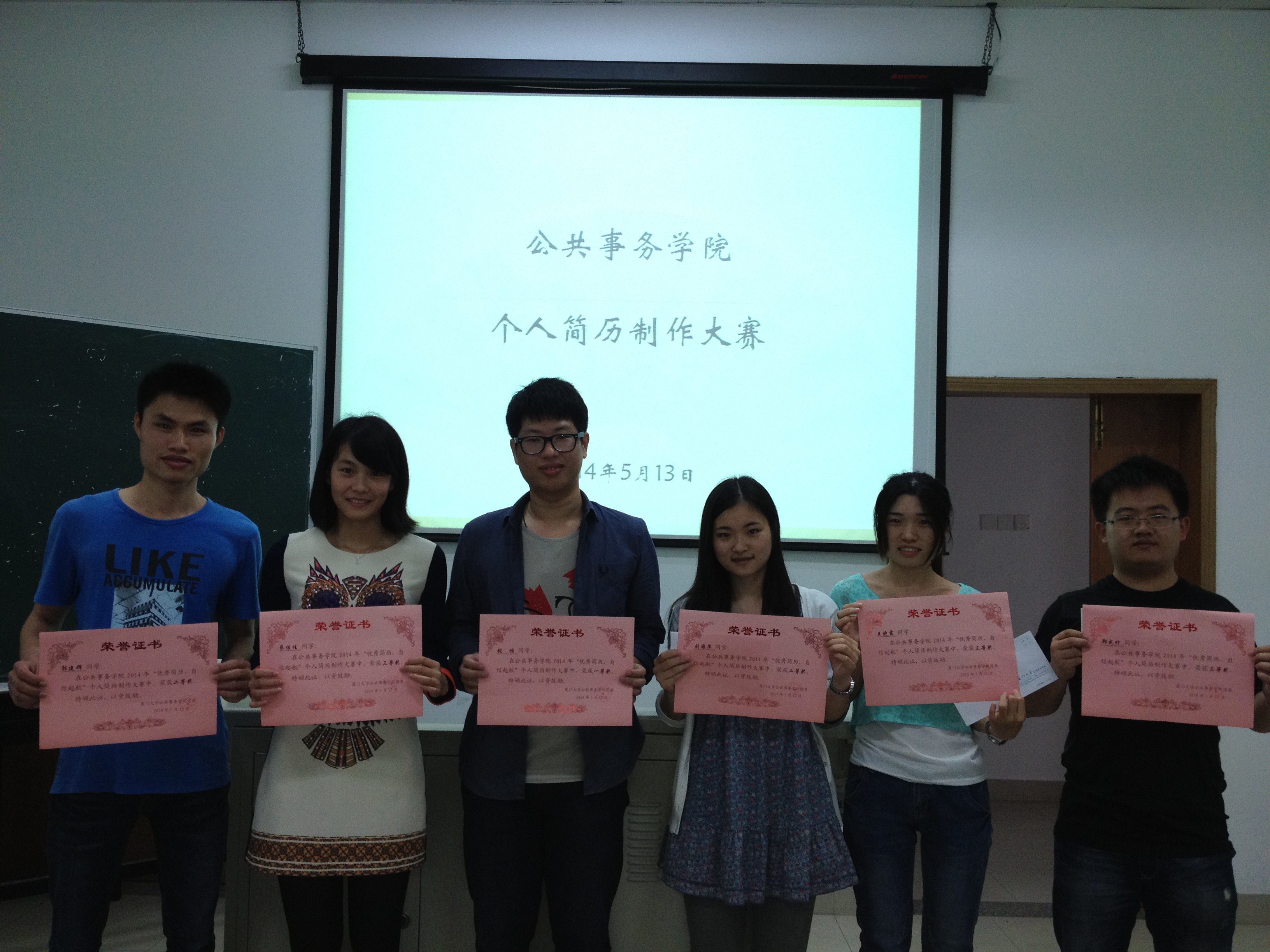 经过简历制作初赛、专业指导培训和修改环节,公共事务学院2014年“个人简历制作大赛”于2014年5月12日圆满落幕,本次比赛评出了一、二、三等奖共六份作品,具体获奖名单如下: